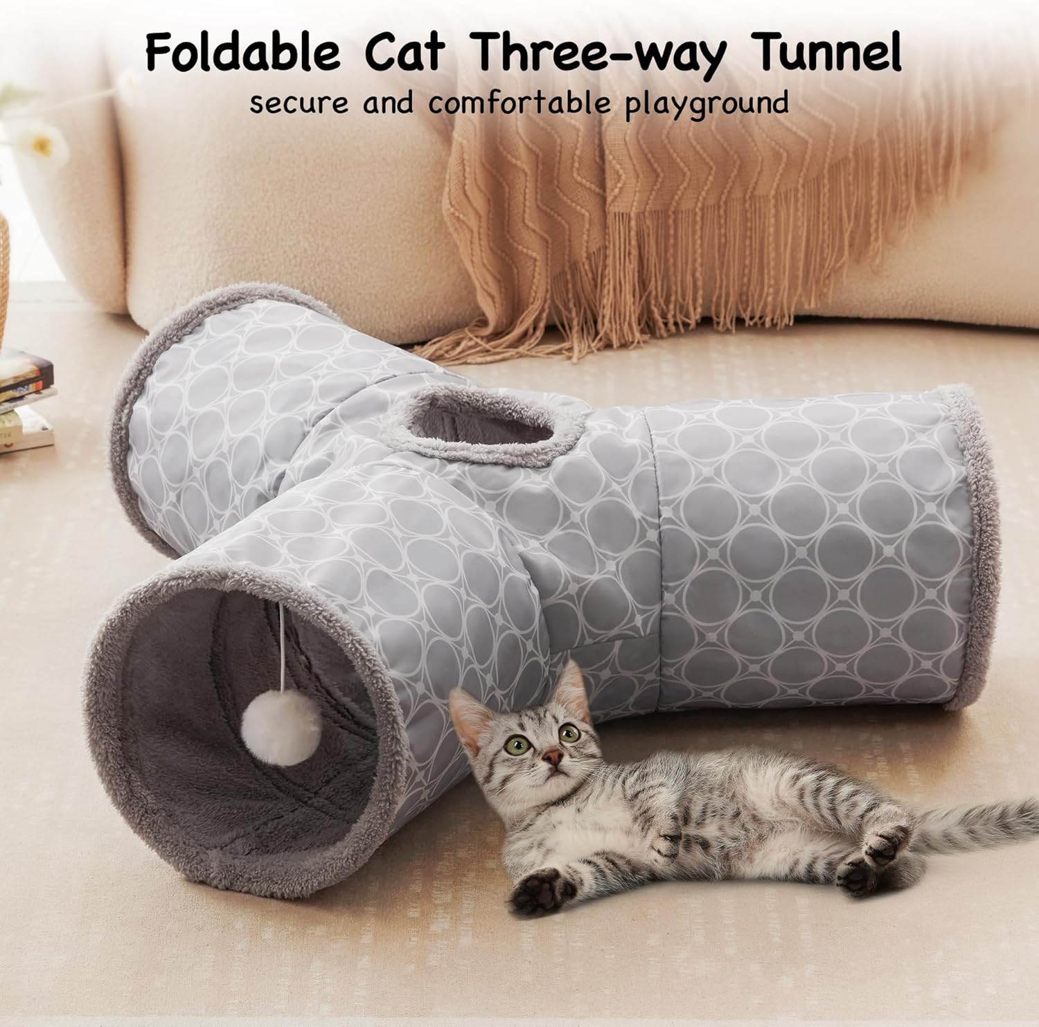 - Best Ways to Play: Our cat tunnel with 3 spacious tunnels, peephole & ball toy, this popular cat toy gives your kitty more ways to have fun. Provides hours of exercise & self-amusement. The fleece lining inside makes it warmer and more comfortable.