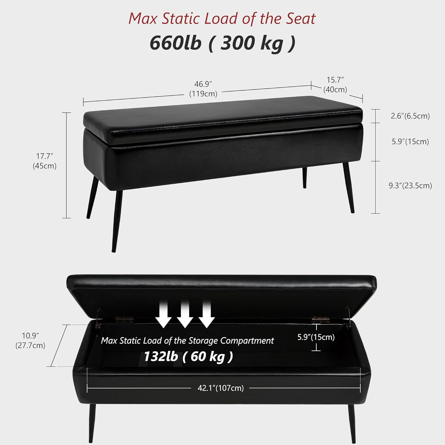 - STURDY AND SAFE: This end of bed bench features a solid wood frame supported by sturdy steel legs that can hold up to 660 pounds for durability. The lid-mounted opening and closing hinges are able to open and close slowly without worrying about overwhelming your hands.