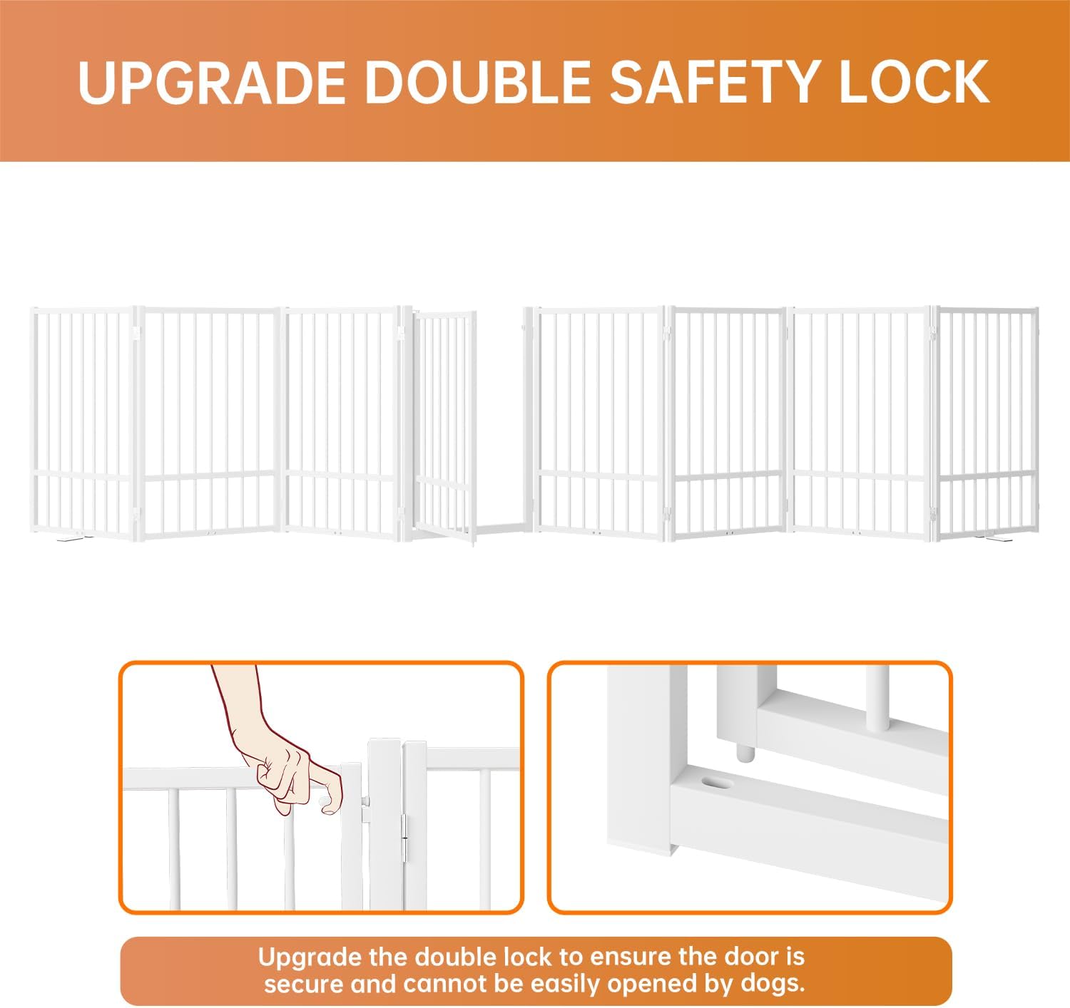- [Walk-Through Door]: 4 panels and 6 panels dog pet gate features a convenient walk-through door, the door can open in both directions, allowing easy access. The walk-through door is equipped with a safe double lock system to ensure that the door will not be easily opened by the dog.