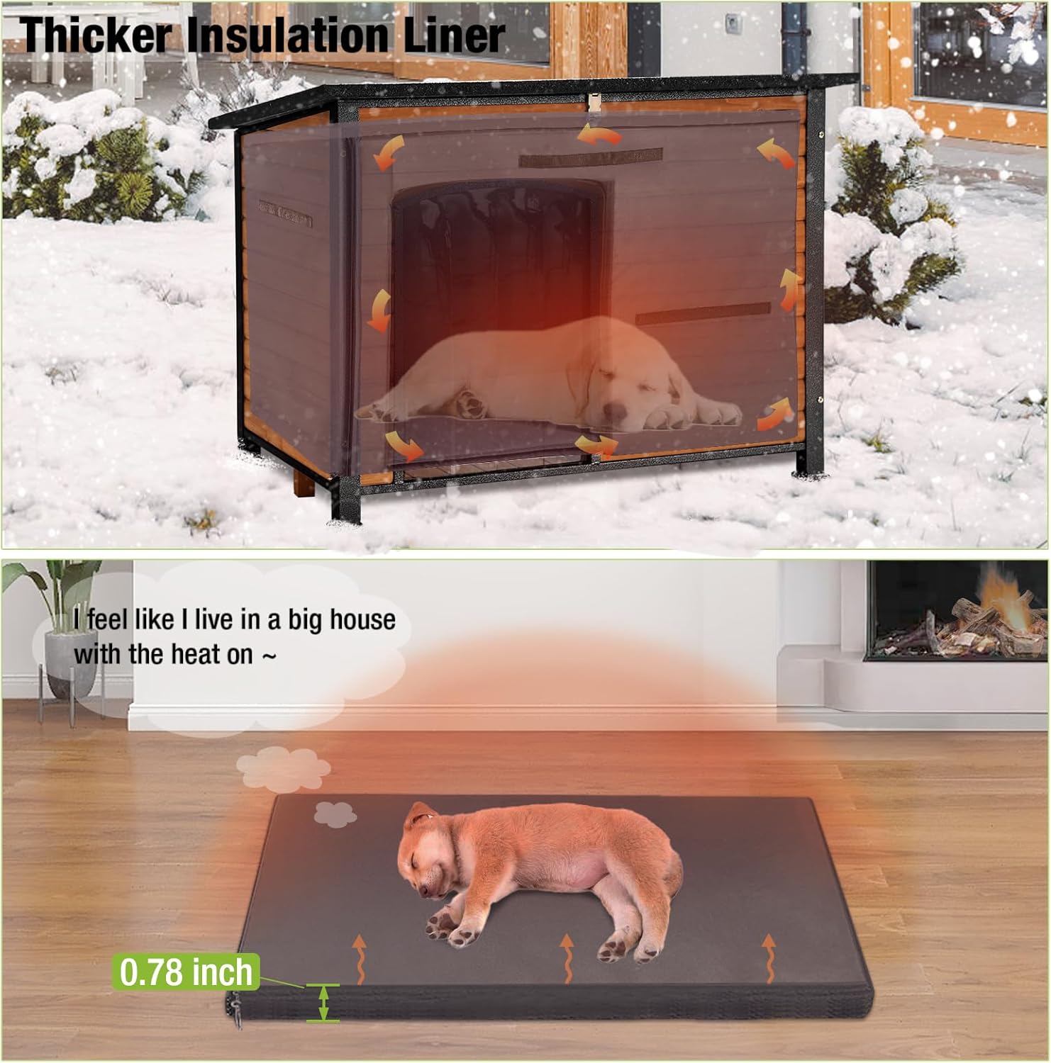 - Sponge Liner Inside: Outdoor dog house with 0.78" thick sponge insulated liner will cut the outdoor cold temperature effectively keep your pets warm in cold weather. The liner is easy to attach and can be machine washable