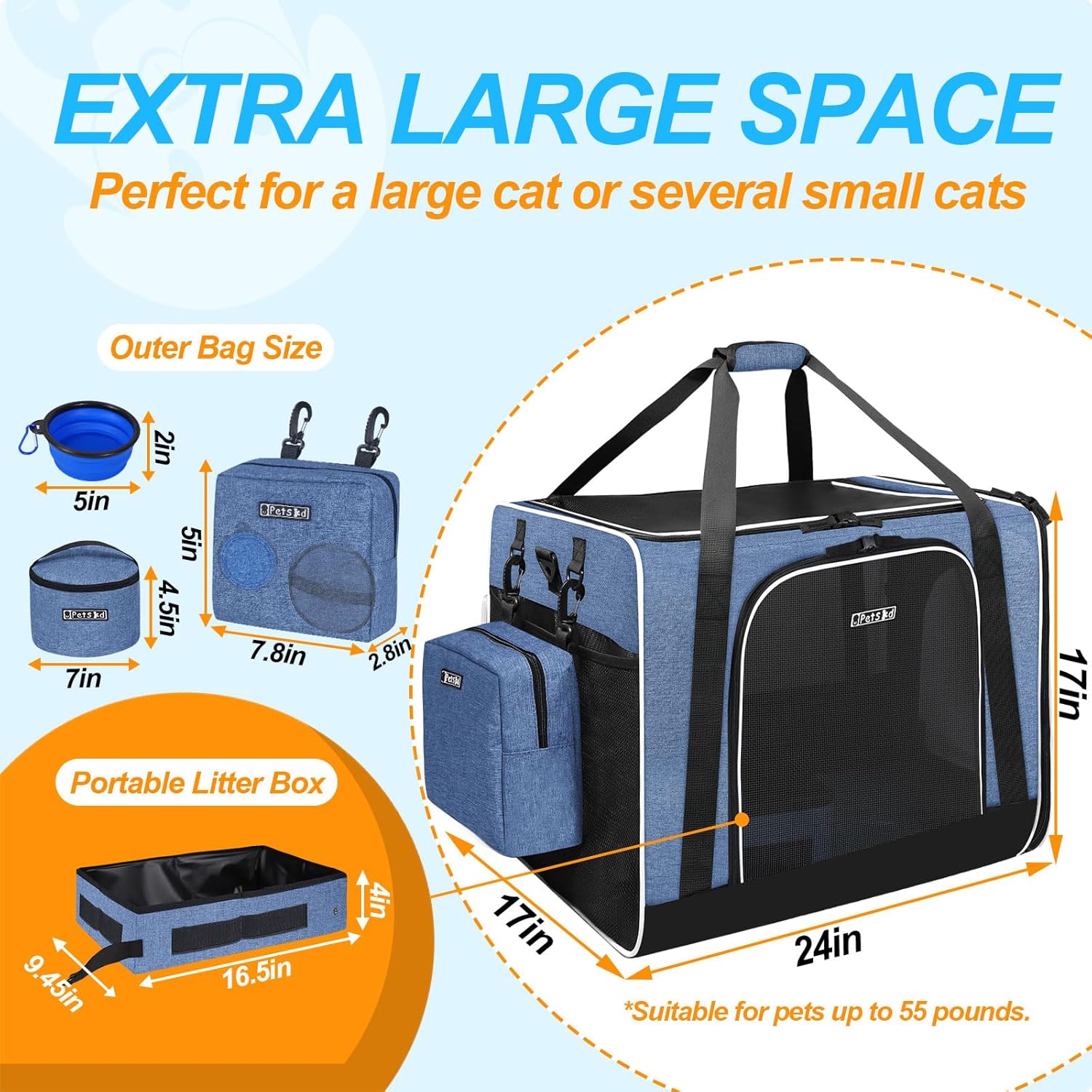 - 【EXTRA LARGE SPACE 】The carrier size:24"x17"x17", Suitable for pets up to 55 pounds. perfect for a large cat or several small cats.