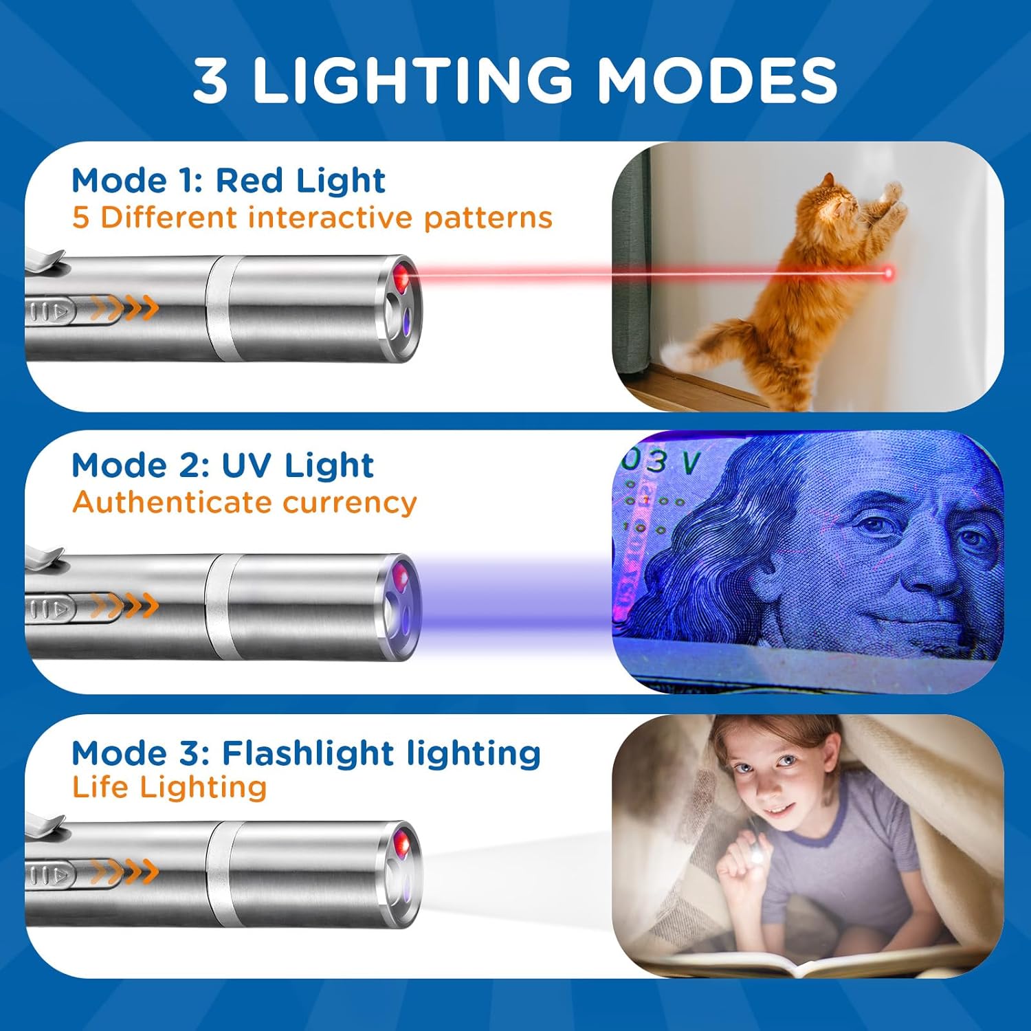 - 【7 In 1 Modes】Koackl cat toys has 5 patterns: red dot, mice, butterfly, smile face, star. Scoll the black gear on the head to change to 3 different modes: red, purple, white. You can use the purple to check couterfeit currency and check your pets. White mode can be used for emergency lighting. The red mode can be used to play with your cat or for PowerPoint presentation.