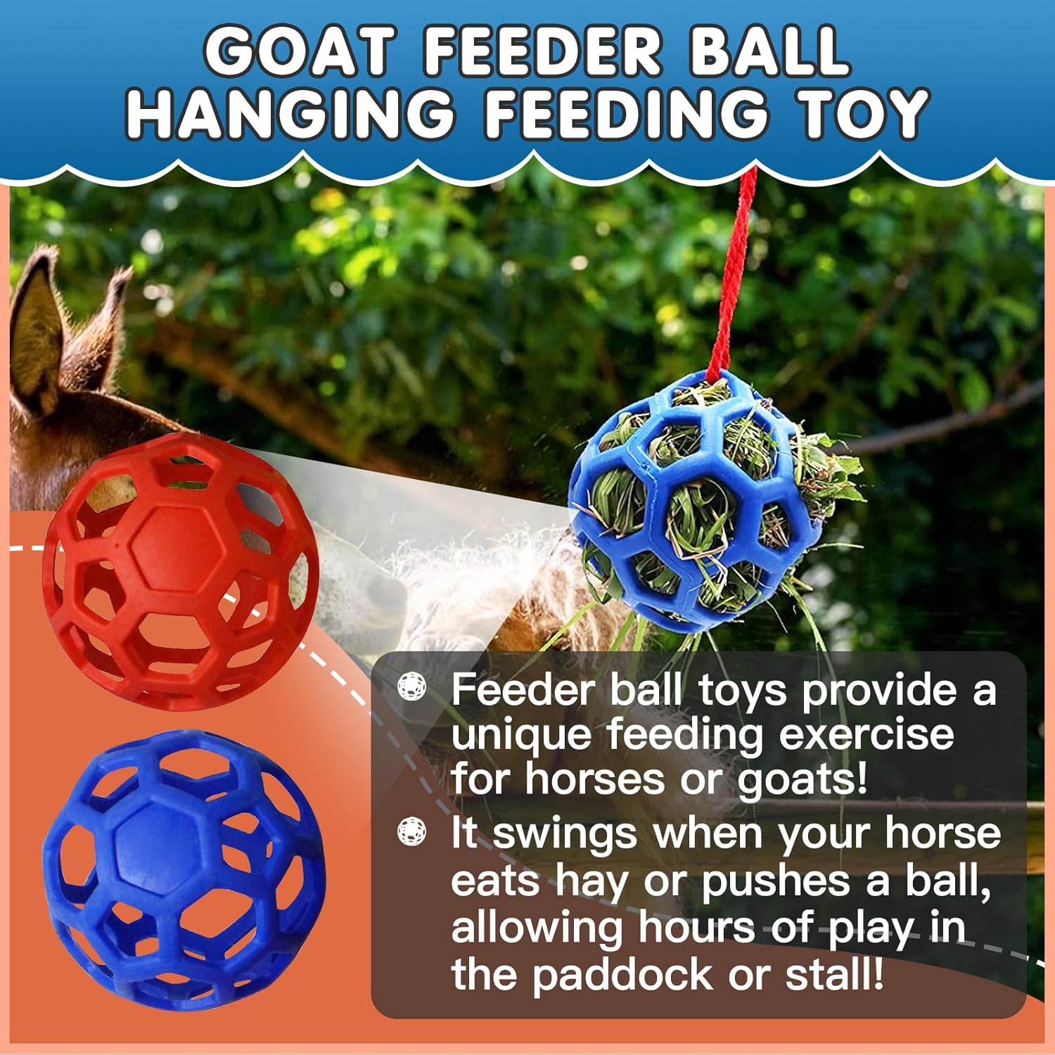 - Kindly Note: Do not use it as a feeder, this just a goat feeder ball hanging feeding toy, the main purpose is to keep horse or goat busy and relieve stress