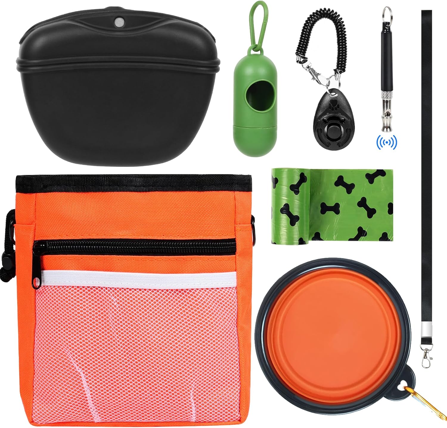 Dog Treat Pouch Pet Training Kit - Silicone Treat Bag Magnetic Closure, Puppy Training Clicker, Dog Whistle, Dog Water Bowls, Poop Bags & Holder, 4 Ways to Wear Walking Fanny Pack - Orange