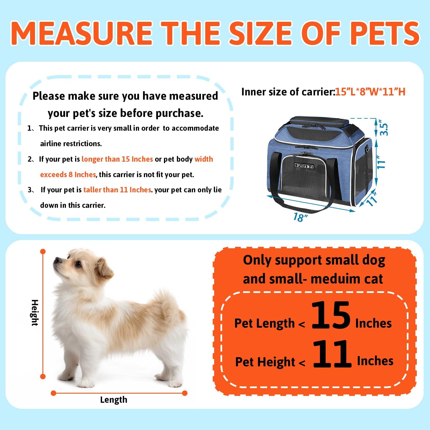 - 【CHECK SIZE BEFORE BUYING】In order to fit the under-seat dimensions of airlines, this carrier can only fit small dogs and cats. We recommend that the pet size you carry be within 15"L x 8"W x 11"H(this carrer's inner size), please choose the carrier reference your pet's length and height. Reference pet weight: dog weight under 10LBS and cat weight under 12LBS.