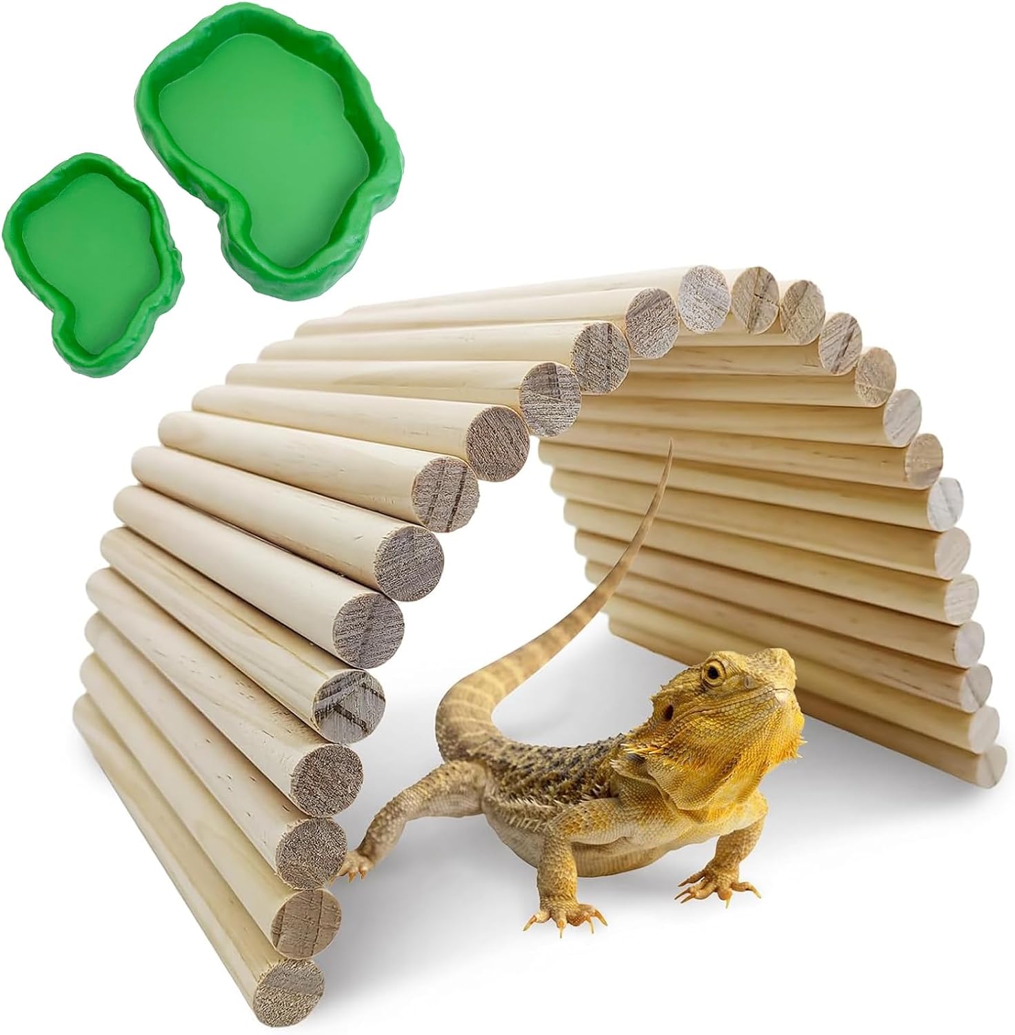 - Products Include: 1 x Wooden Bridge. Size: 15.66"L x 7.8"W. 2 x Reptile Food Water Bowl. Size: 6"L x 4.8" x 0.7"H and 4.2"L x 2.8"W x 0.5"H. Suitable for bearded dragons, lizards, chameleons, tree frogs, geckos, turtles, tortoises, snakes and other reptiles