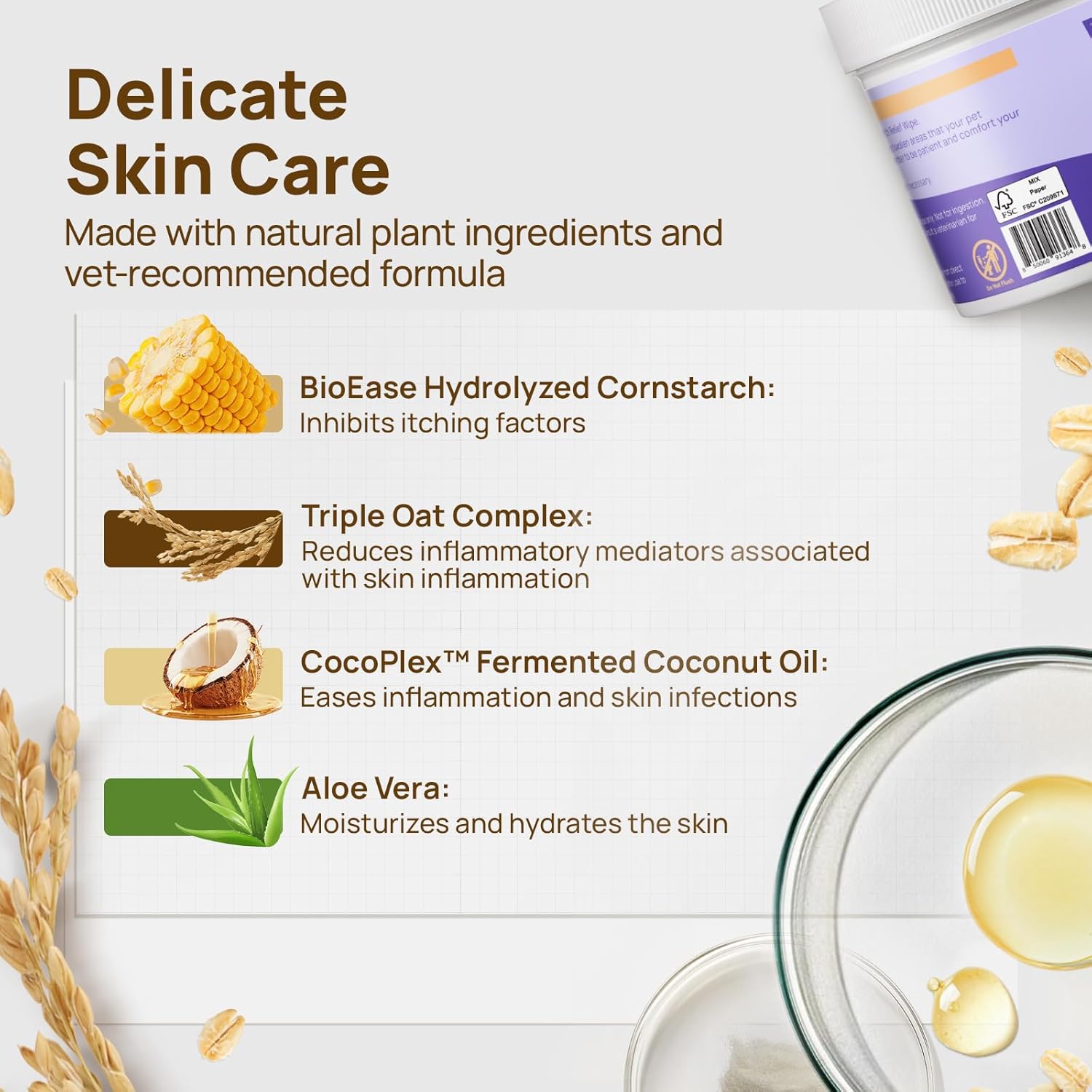 - More Powerful Formula for Root-Level Itch Relief: Itch relief for dogs contain a high concentration of BioEase hydrolyzed cornstarch, which penetrates deeply and offers natural anti-allergic properties for fast and long-lasting itch relief. It effectively inhibits the release of itch factors, addressing itching at its source. Due to its high concentration and absence of artificial fragrances, the wipes have a strong natural plant scent — a true sign of the potency of natural ingredients