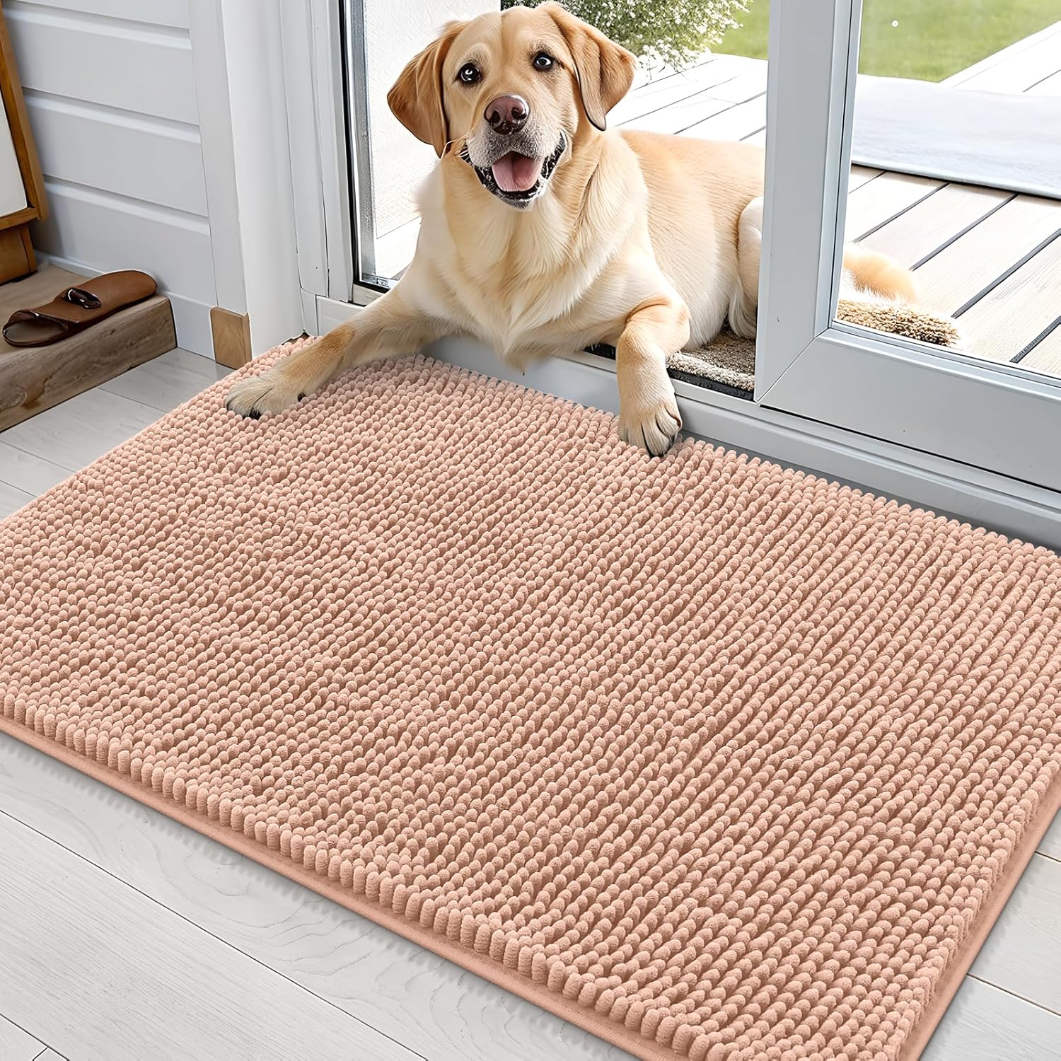 OLANLY Dog Door Mat for Muddy Paws 36x24, Absorbs Moisture and Dirt, Absorbent Non-Slip Washable Doormat, Quick Dry Chenille Mud Mat for Dogs, Entry Indoor Entryway Carpet for Inside Floor, Peach