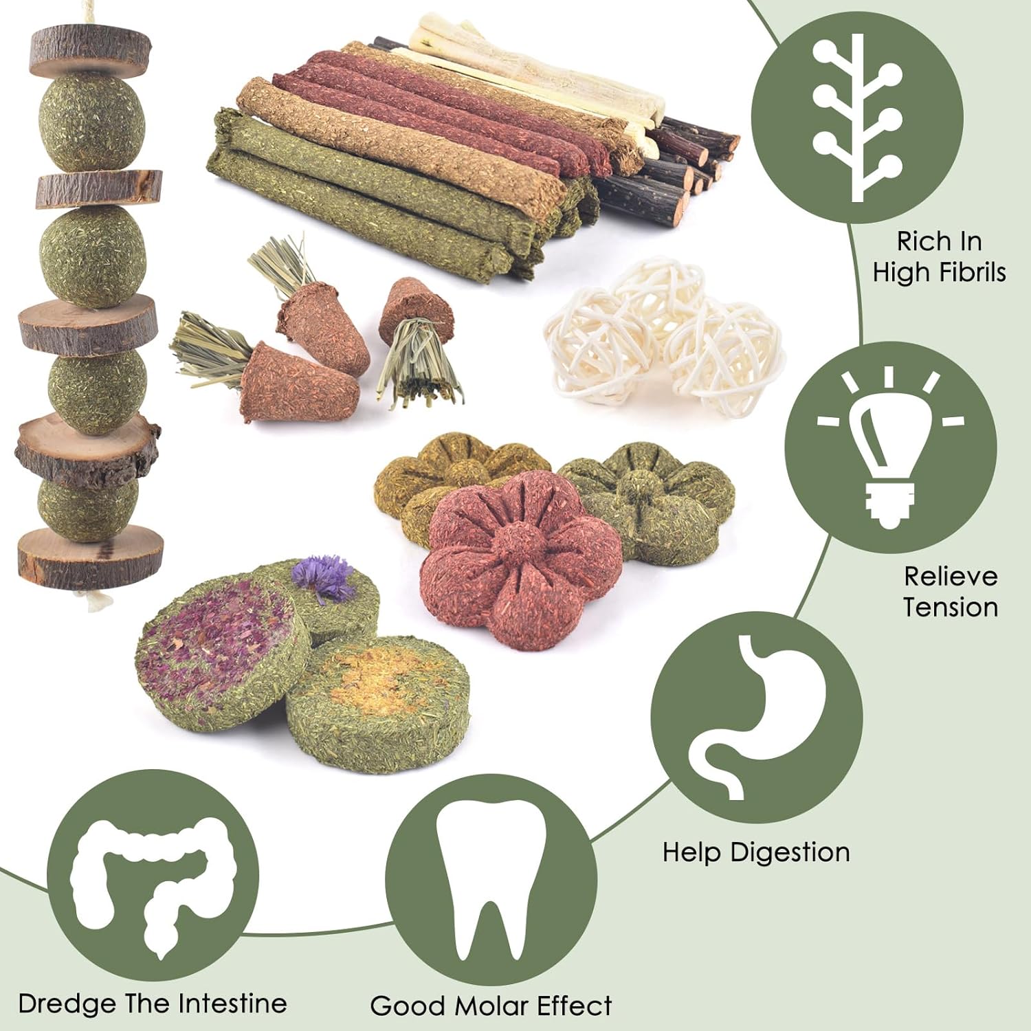 - Natural Hamster Accessories The rabbit toys are made of natural materials including lieschgrass, carrots, rich in fiber, can accelerate gastrointestinal peristalsis, promote digestion and help intestinal inflammation and mild to relieve pain, chew fun, and help prevent boredom by stimulating pets.