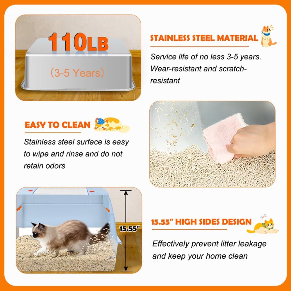 - PREMIUM STAINLESS STEEL - Built with thickened stainless steel, this cat litter box is rust-resistant, scratch-proof, durable and long-lasting. It helps reduce odors more effectively than plastic alternativess, keeping the space fresh. The box holds up to 110 lbs and lasts 3-5 years, reducing the need for frequent replacements