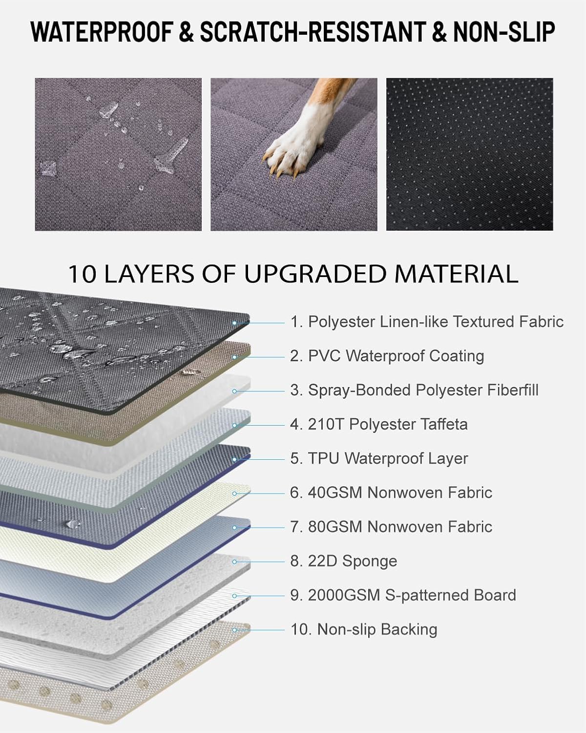 - Waterproof, Scratch-resistant & Non-slip: Constructed with 10-layer materials including PVC coating, TPU and 210T polyester, this dog back seat extender resists spills and wear. The 8mm high-density sponge and S-patterned board ensure stability, while the polyester linen-textured surface provides grip and scratch resistance.