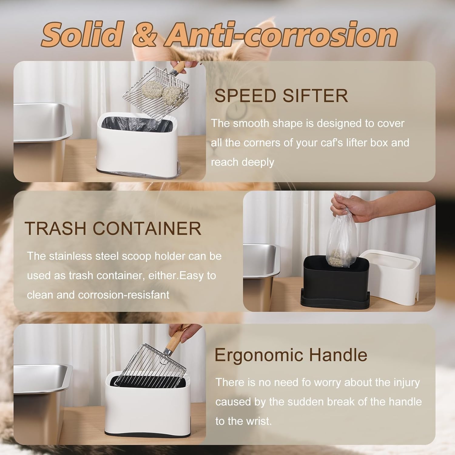 - 【Cat litter scoop with holder for storage】Our metal cat litter scoop achieves improved efficiency and cleaning speed. The litter scoop comes with a litter scoop holder box to keep your cat area clean and tidy