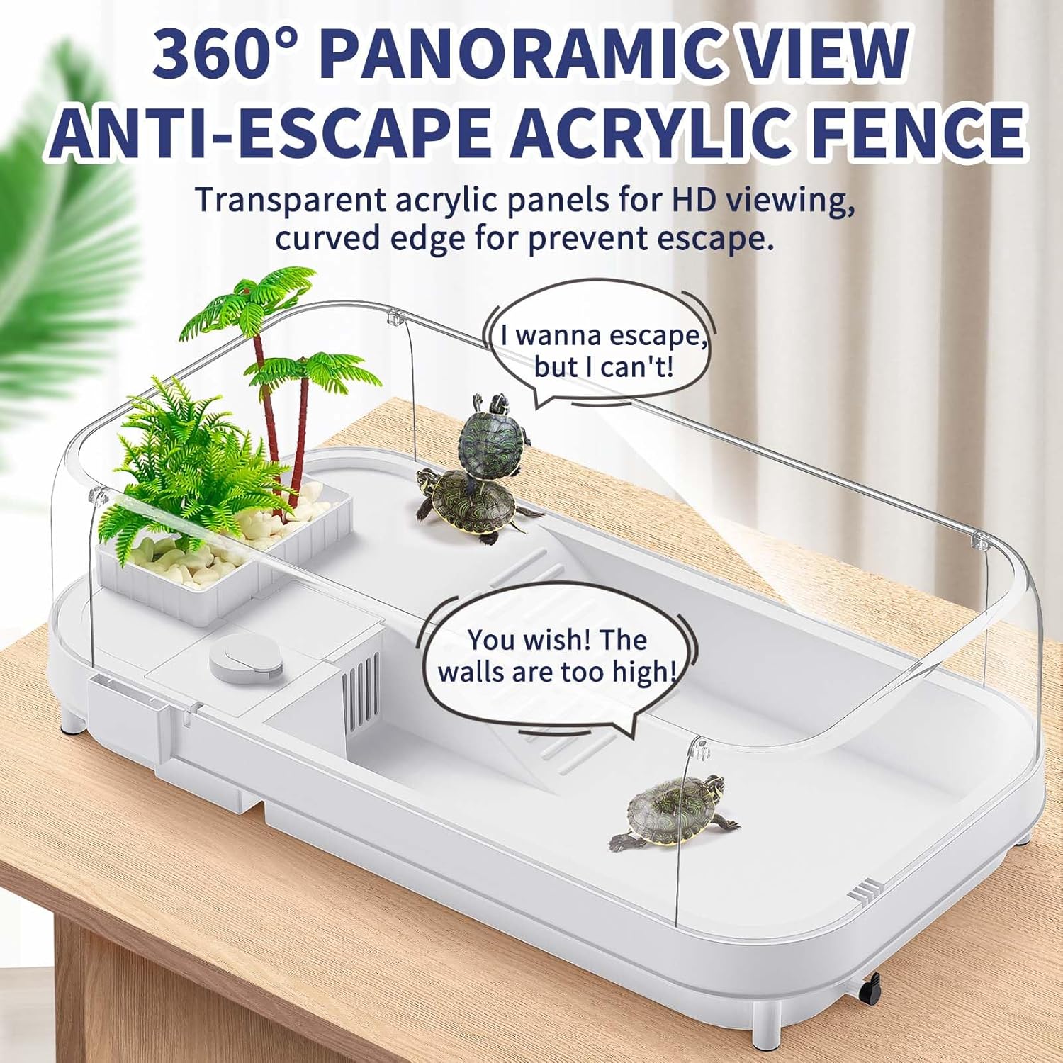- 【Heightened and Curved Fences】Tank size is 22.8'' x 12.6'' x 7.7''. With special-designed acrylic fences, your pet turtles won’t escape. Suitable for small turtles, crabs and other small reptiles within 4.0’’.
