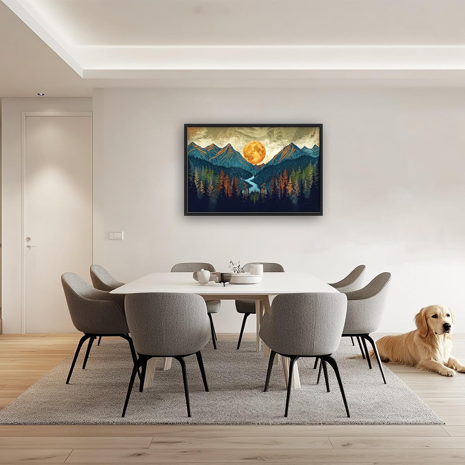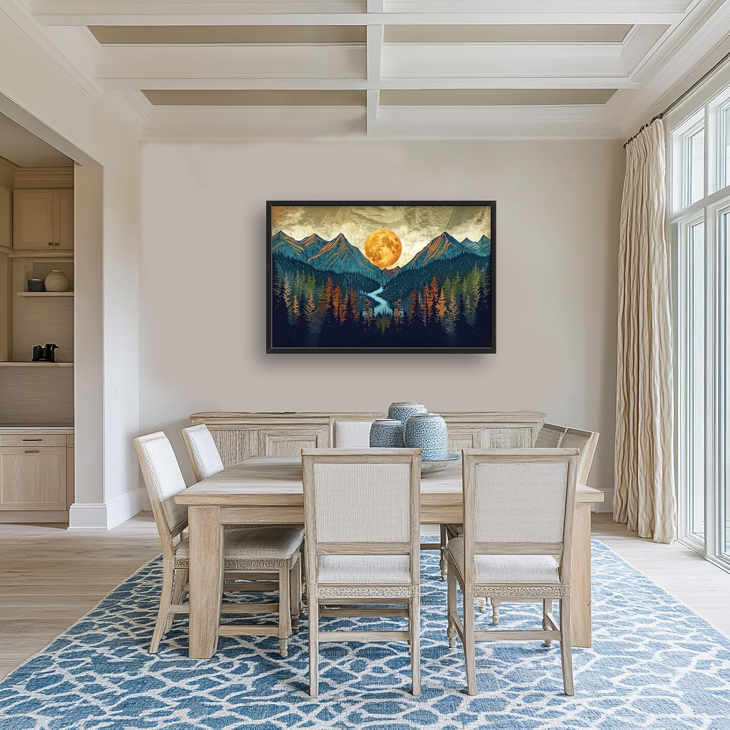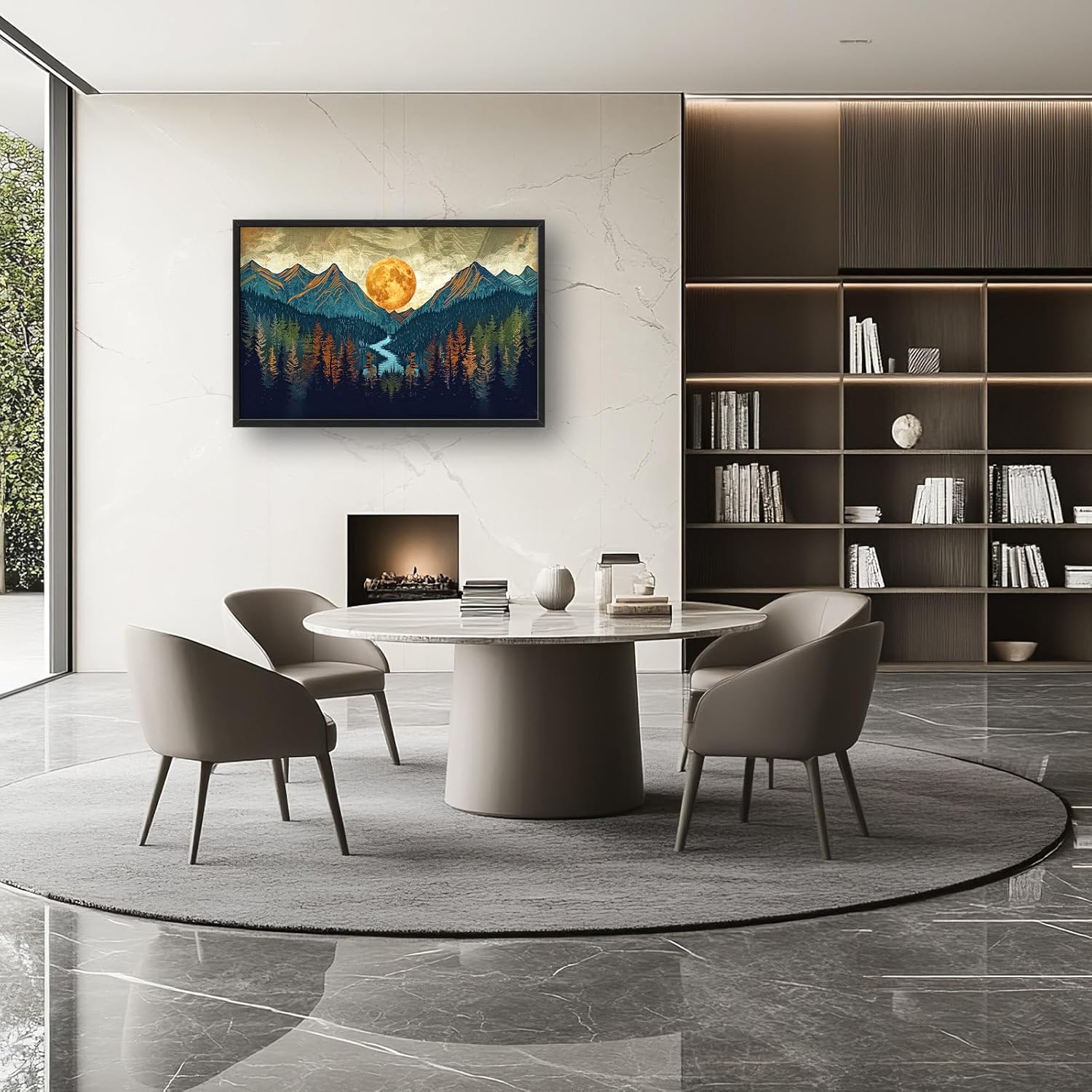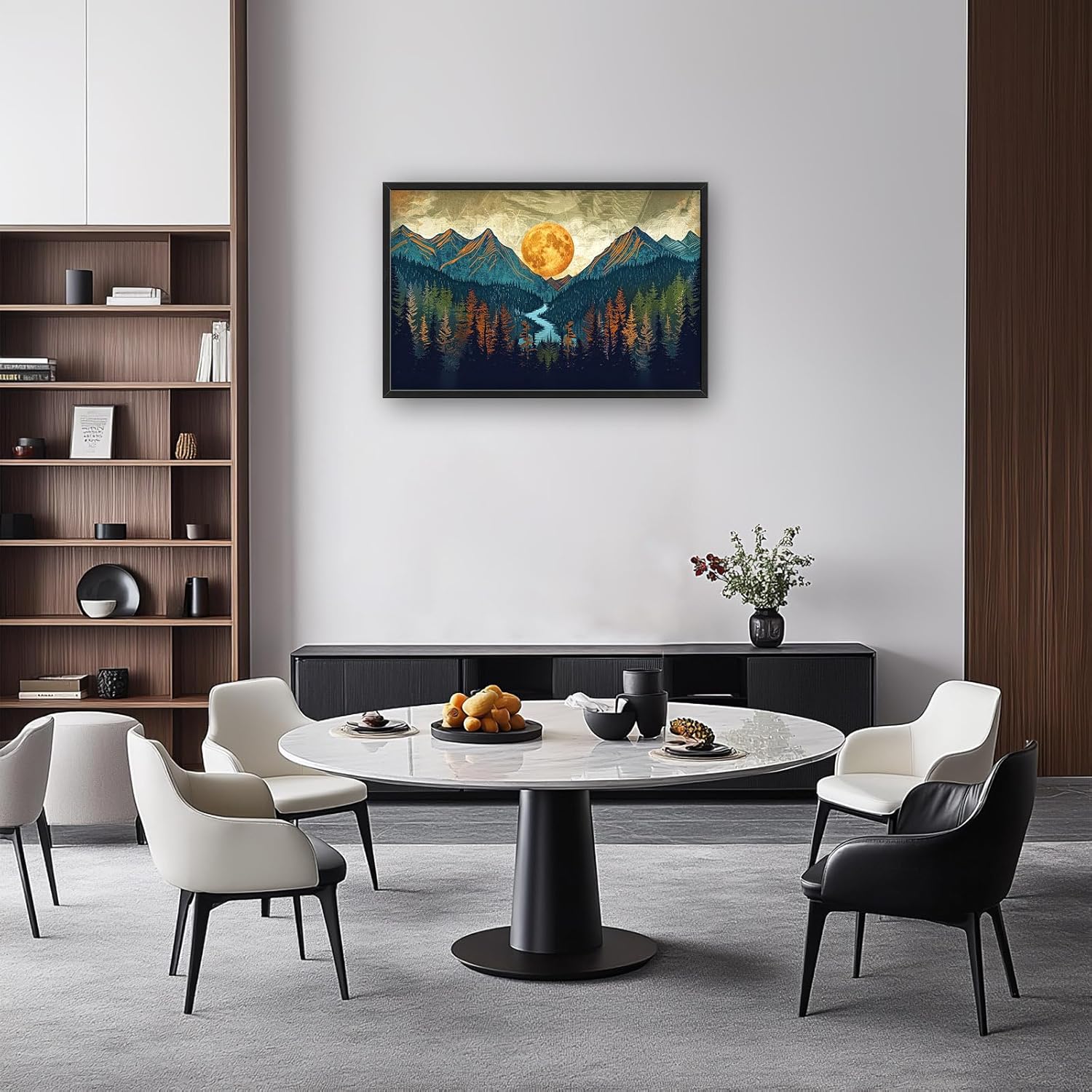 - 【Unique Design】An artwork of mountains and forests with the moon rising between them. Use muted earth tones, a forest green color for the trees, and a deep blue to depict the water flowing through the valley. The sky should have shades of grey or brown, with golden hues from the sunset casting on the mountain peaks. In the center is a large, orange sun shining over everything.