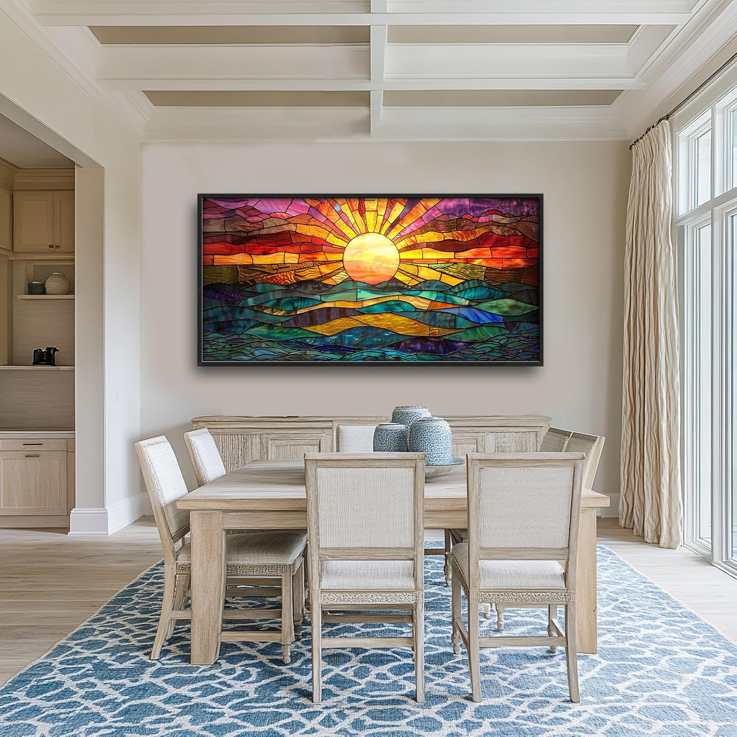 - 【Unique Design】This framed painting depicts the sun rising over the ocean in bright colors and intricate patterns. The water is calm as it reflects all these hues, creating an amazing visual effect. In the center of the picture, the golden sun casts a warm light across the entire picture. The artwork captures the beauty of dawn, symbolizing new beginnings and hope.