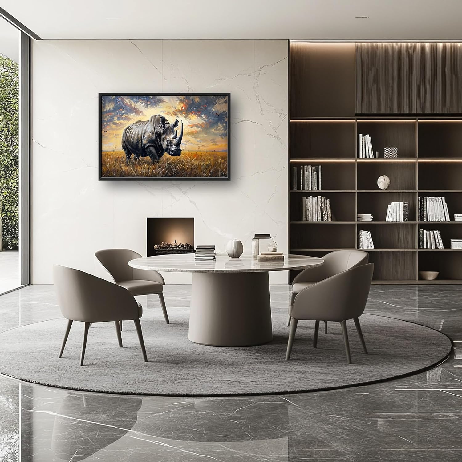 - 【Unique Design】A majestic rhinoceros stands tall in the savannah, with its powerful horns and thick skin, against a backdrop of golden grasslands under a dramatic sky. The painting captures the essence of wildlife beauty, emphasizing details like intricate fur patterns on its body and expressive facial features.