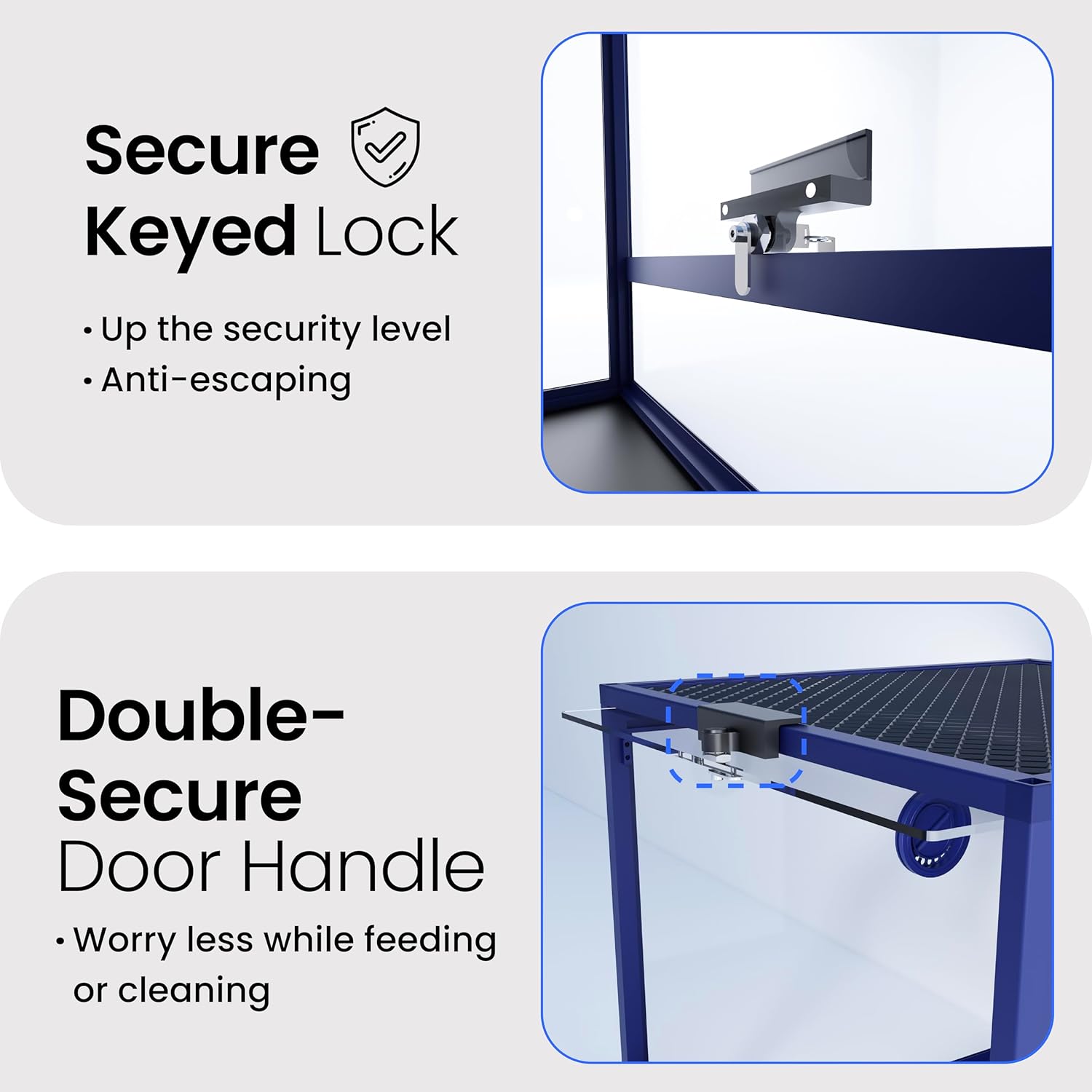 - ăLock IncludedăA tempered glass door with a safety keyed lock to prevent escape and accidental opening by others. NO GAPS FOR ESCAPING with fully closed structure. Rigid tempered glass doors for extra safety.