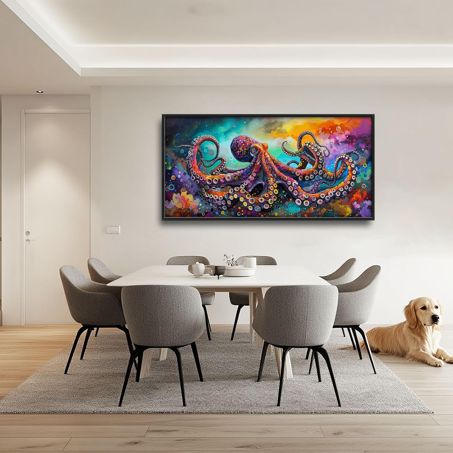 - 【Unique Design】A vibrant and colorful painting of an octopus with multiple tentacles, each covered in small flowers or patterns, set against the backdrop of a swirling galaxy filled with hues of purple, blue, green, orange, red, yellow, and pink. The octopus's skin is rough-textured and bumpy. It appears to be dancing gracefully among the stars.