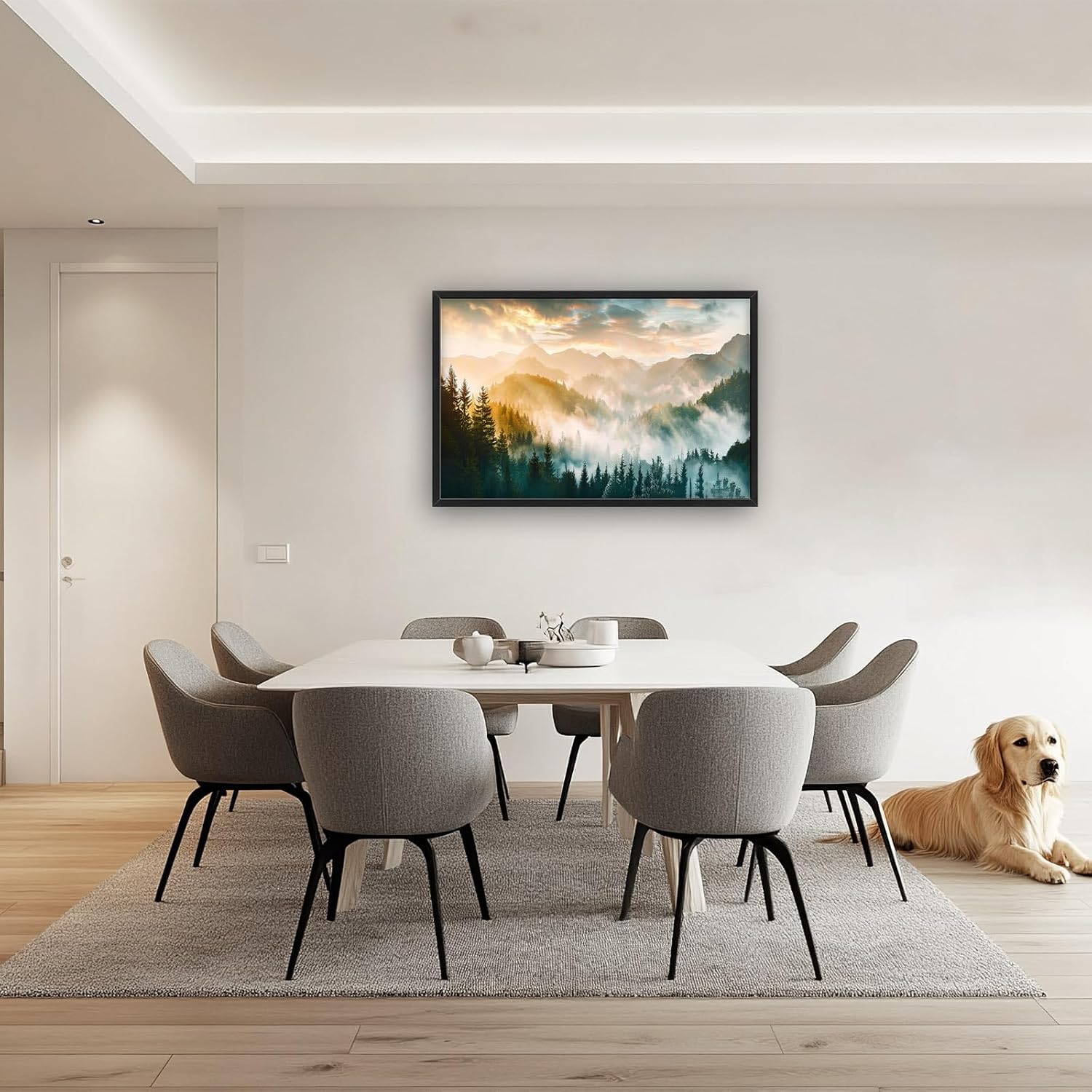 - 【Unique Design】A panoramic view of mist-covered mountains and dense forests, bathed in the soft glow of sunrise. The scene captures an enchanting atmosphere with ethereal clouds and gentle sunlight filtering through the trees.