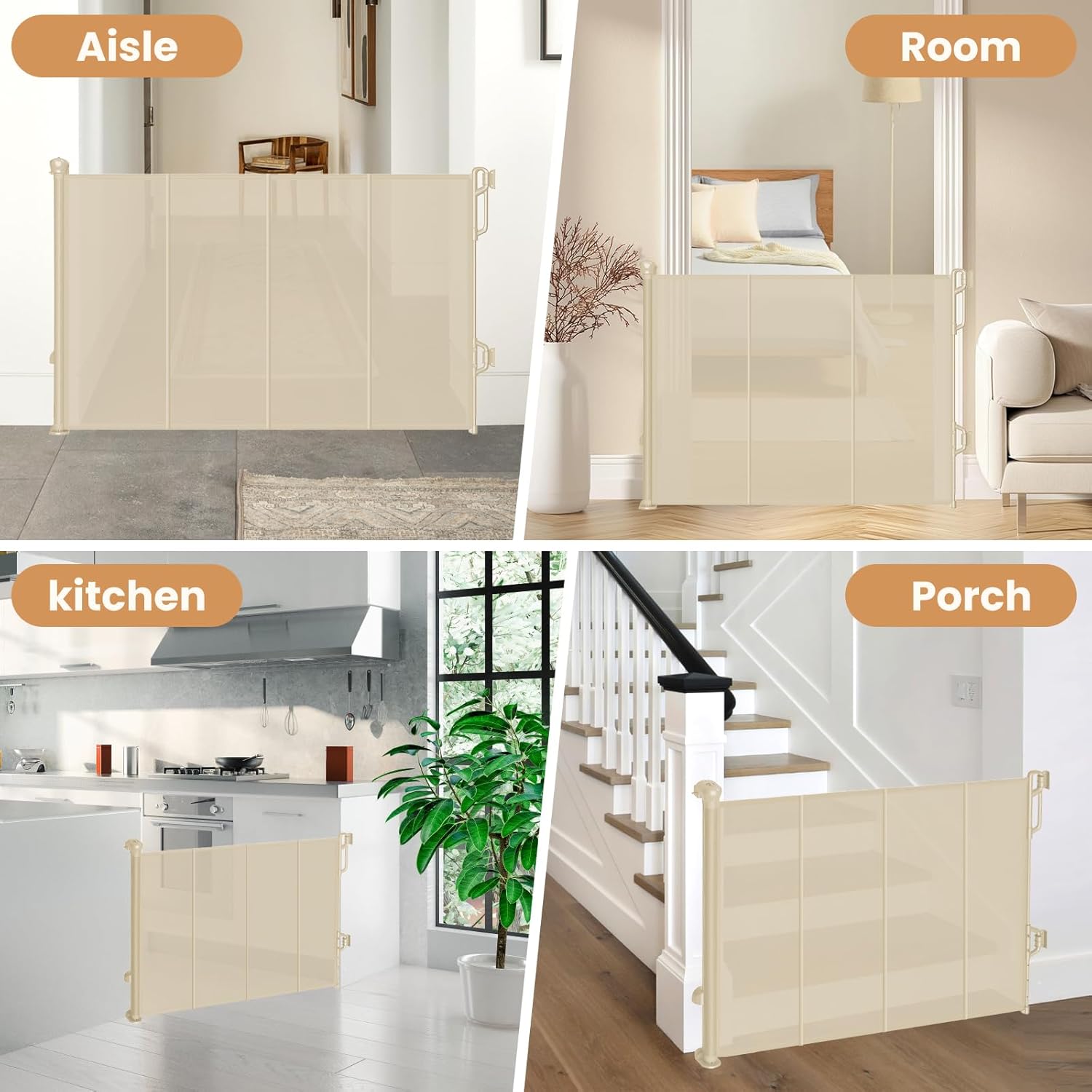 - 【Fits Your Purpose Perfectly】- The retractable baby gate is a perfect solution for providing safety and secruity space for children and pets. It is used for children and pets blocking off their way out or in. It's suitable for the kitchen, bedroom, living room, stairs, and other off-limit areas inside your home, providing a safe area for your little one. For use in both indoor and outdoor spaces.