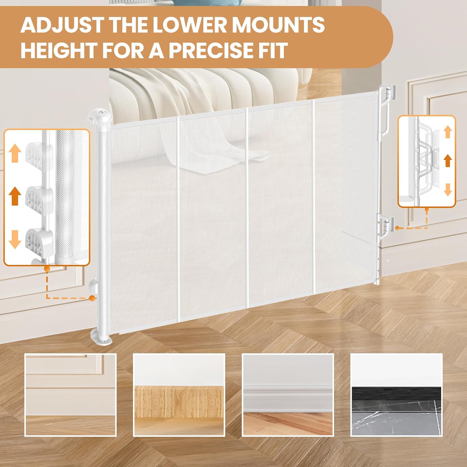 - 【Adjustable Mounts & Easy Installation】 - The lower gate mount & catch mount that can fit any wall with / without baseboard, making it safer, more practical and easier to install. Each pack contains 1 retractable baby gate and the required installation accessories. Mesh dog gate can be widely used for indoor and outdoor areas such as doorways, stairs, hallways.