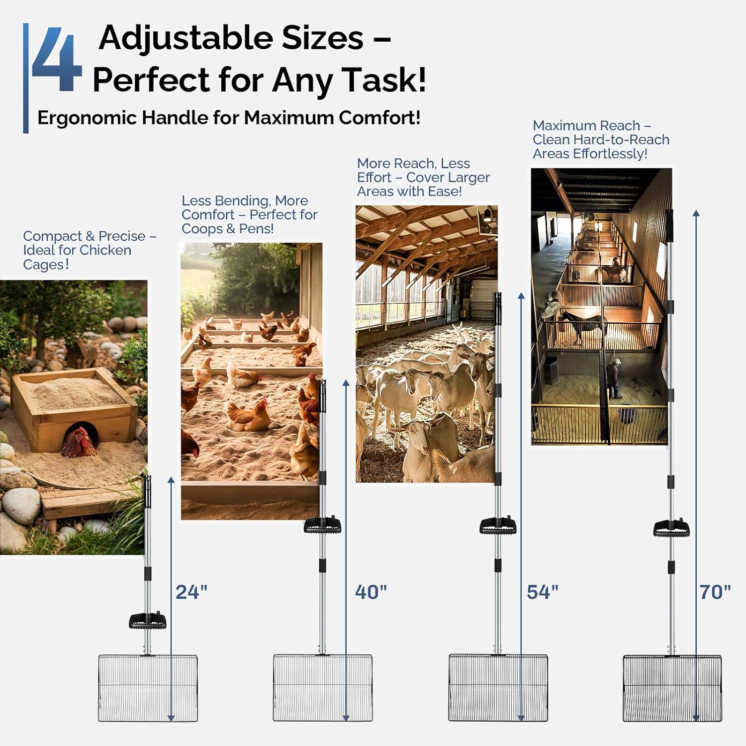 - ๐๐ซ๐ ๐จ๐ง๐จ๐ฆ๐ข๐ & ๐๐๐ฃ๐ฎ๐ฌ๐ญ๐๐๐ฅ๐ ๐๐จ๐ง๐ ๐๐๐ง๐๐ฅ๐ โ ๐๐๐ฏ๐ ๐๐จ๐ฎ๐ซ ๐๐๐๐ค: The handle extends from 24 to 70 inches, allowing for adjustable length based on your height. Our Hdnbsp chicken coop cleaning tools can be adjusted to four different specification sizes: 24 inches, 40 inches, 54 inches, and 70 inches. Say goodbye to bending over and back pain while cleaning your chicken coop, goat stalls, or horse barns. Clean standing up with ease!