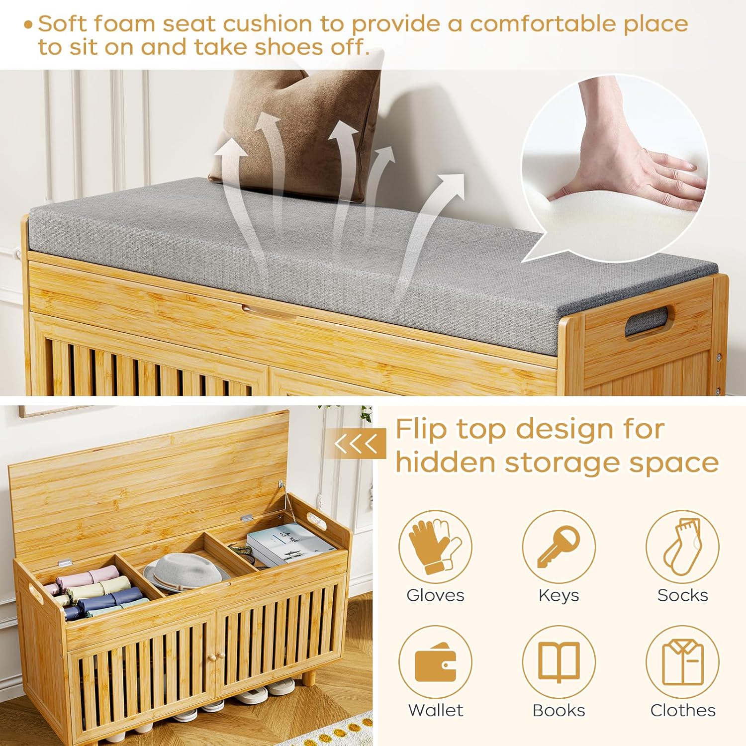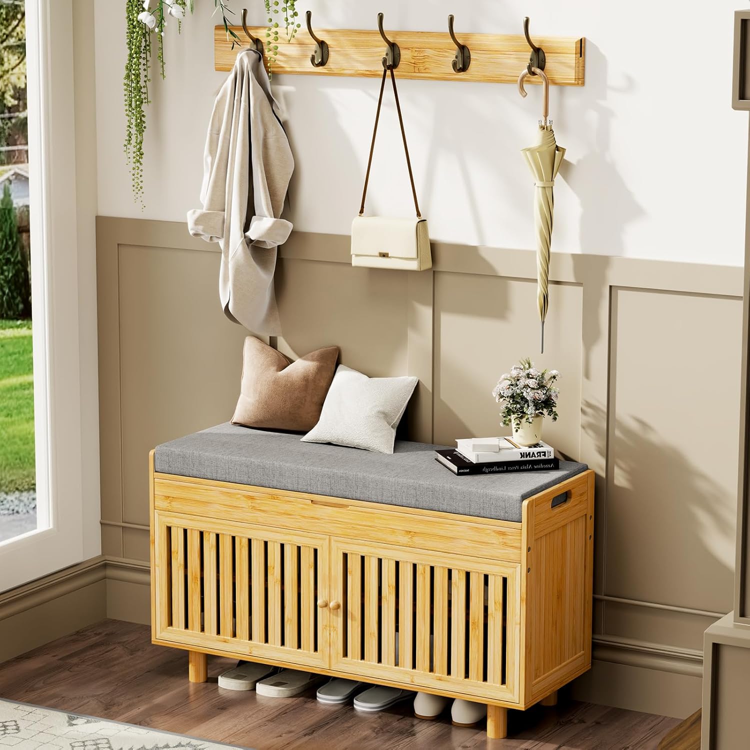 Coat Rack Shoe Bench Set, Bamboo Shoe Storage Bench with Seat Cushion & 5 Hooks, Hall Tree Entryway Bench with Lift Top Hidden Storage, 35.4" W x 12.6" D x 19.7" H, for Entryway, Living Room, Bedroom