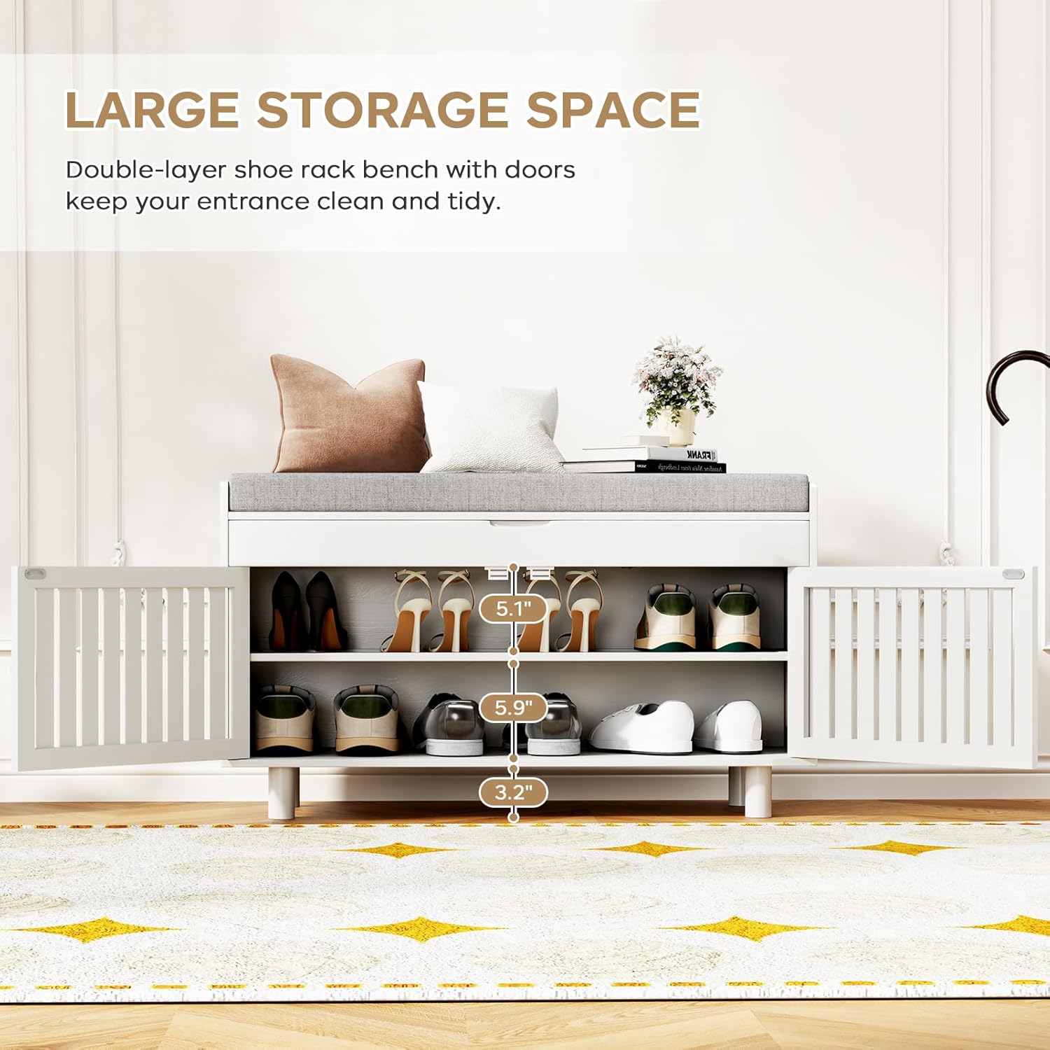 - 【Large Storage Unique Design】- This storage bench with hidden drawer and 2-door cabinet, that can help you classified storage your belongings. The hidden drawer under the cushion can store socks, keys, wallets and other small items to avoid loss. The 2-door cabinet provides a spacious space for classified storage of different types of shoes, clothes, toys, etc. As a shoe bench, this shoe bench can hold 6-8 pairs of shoes.