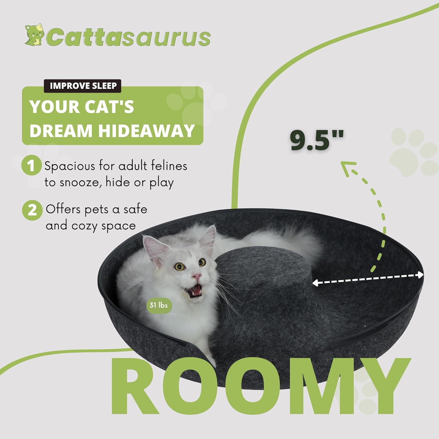 - Durable & Cat-Friendly Design: The Cattasaurus Peekaboo Cat Cave is made from non-toxic, odor-resistant felt that's built to last. It resists pilling and supports safe scratching - perfect as a cat tunnel bed, cat bed cave, or cat scratcher bed. Ideal for all seasons, it offers a snug cat donut bed up top and a comfy cat tunnel below.