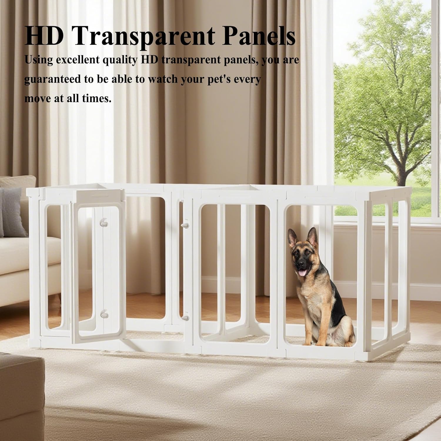- 【MODERN & BEAUTIFUL DESIGN】- Our dog playpen breaks the traditional cage fence design, made of bright and transparent material, like a bright pet home, more beautiful, easy to clean, so that your pet is no longer anxious, no longer feel imprisoned, no longer worry about your pet getting stuck in the playpen, and it is also convenient for you to observe your beloved pets.