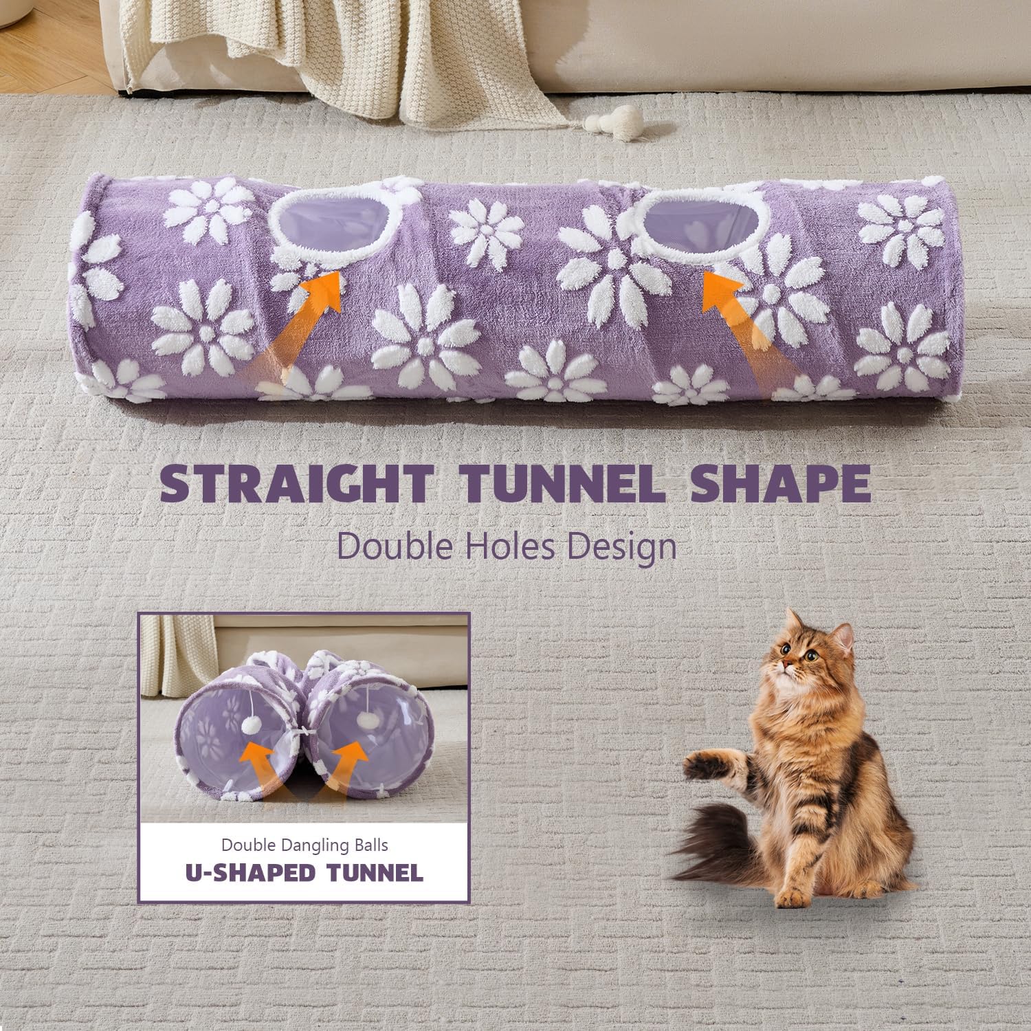 Straight Cat Tunnel for Indoor Cats 47"x12", Cute Cat Toys Collapsible Tunnel Tube with Balls for Puppy Kitten Rabbit, Purple Flower