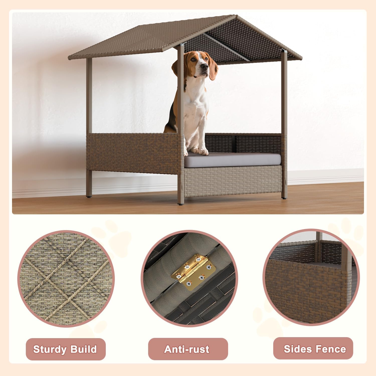 LEMBERI Outdoor Rattan Dog House with Canopy, Indoor Dog Bed for Small/Medium Dogs with Removable Cushion, Washable Cover, Dog Shelter for Patio, Deck, Yard, Pool, Gray