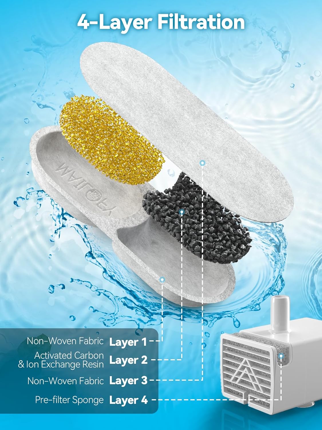 - 4-Layer Filtration System: The fountain features a 4-layer filtration system that includes activated carbon, ion exchange resin, non-woven fabric, and a high-density pump sponge, which ensures that every slip is fresh water.