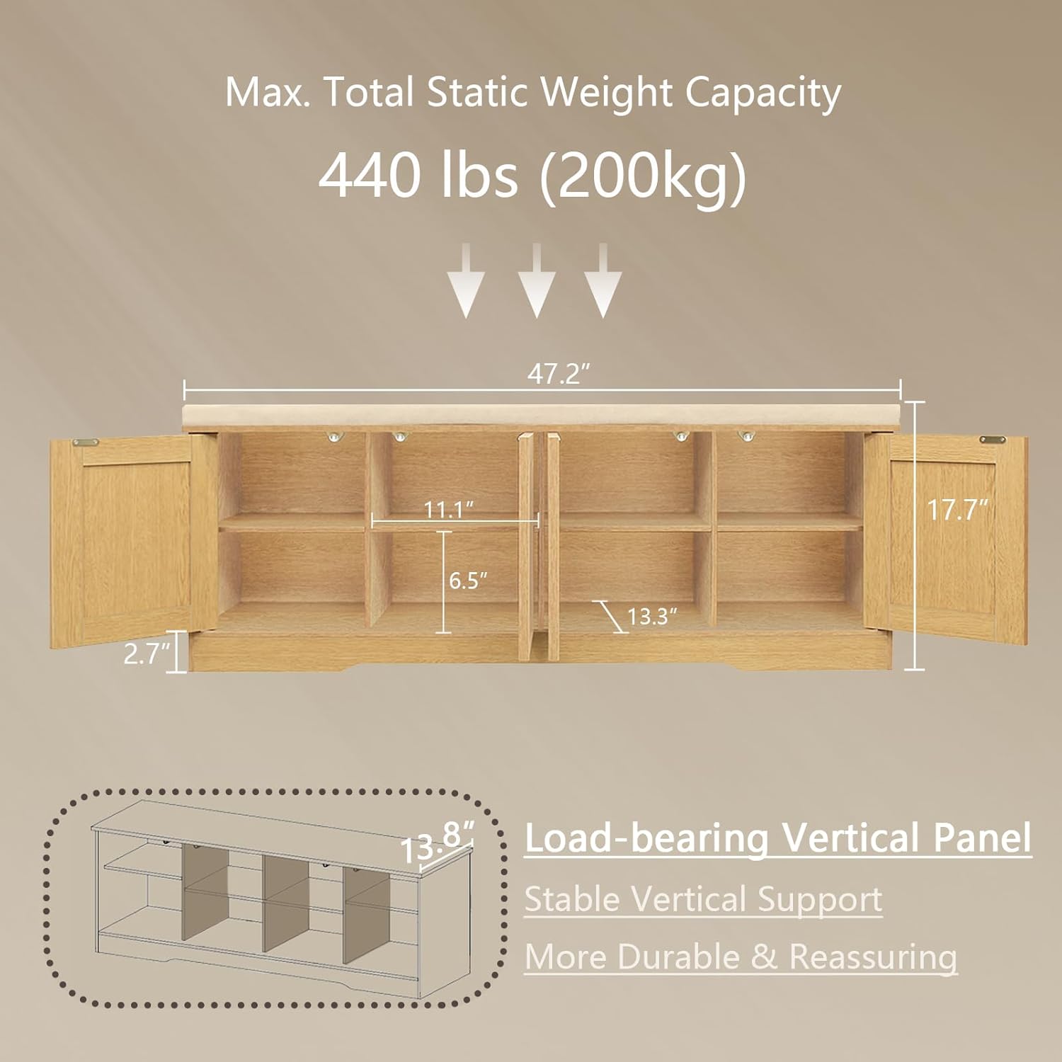 DINZI LVJ Shoe Bench, Entryway Storage Bench with Doors, Cushion, 2-Tier Shoe Rack with 8-Cubby, 47.2”L x 13.8”W Shoe Organizer Cabinet, Adjustable Shelf, Living Room, Bedroom Natural