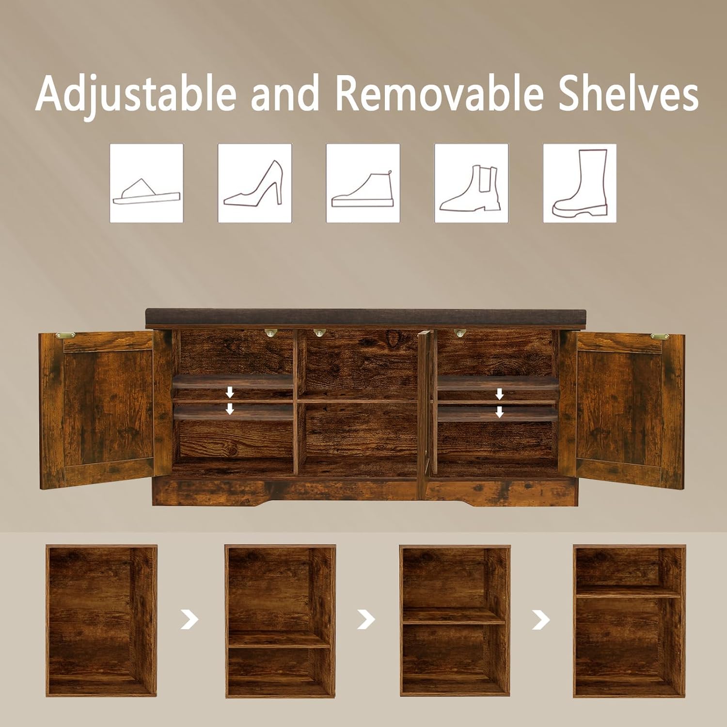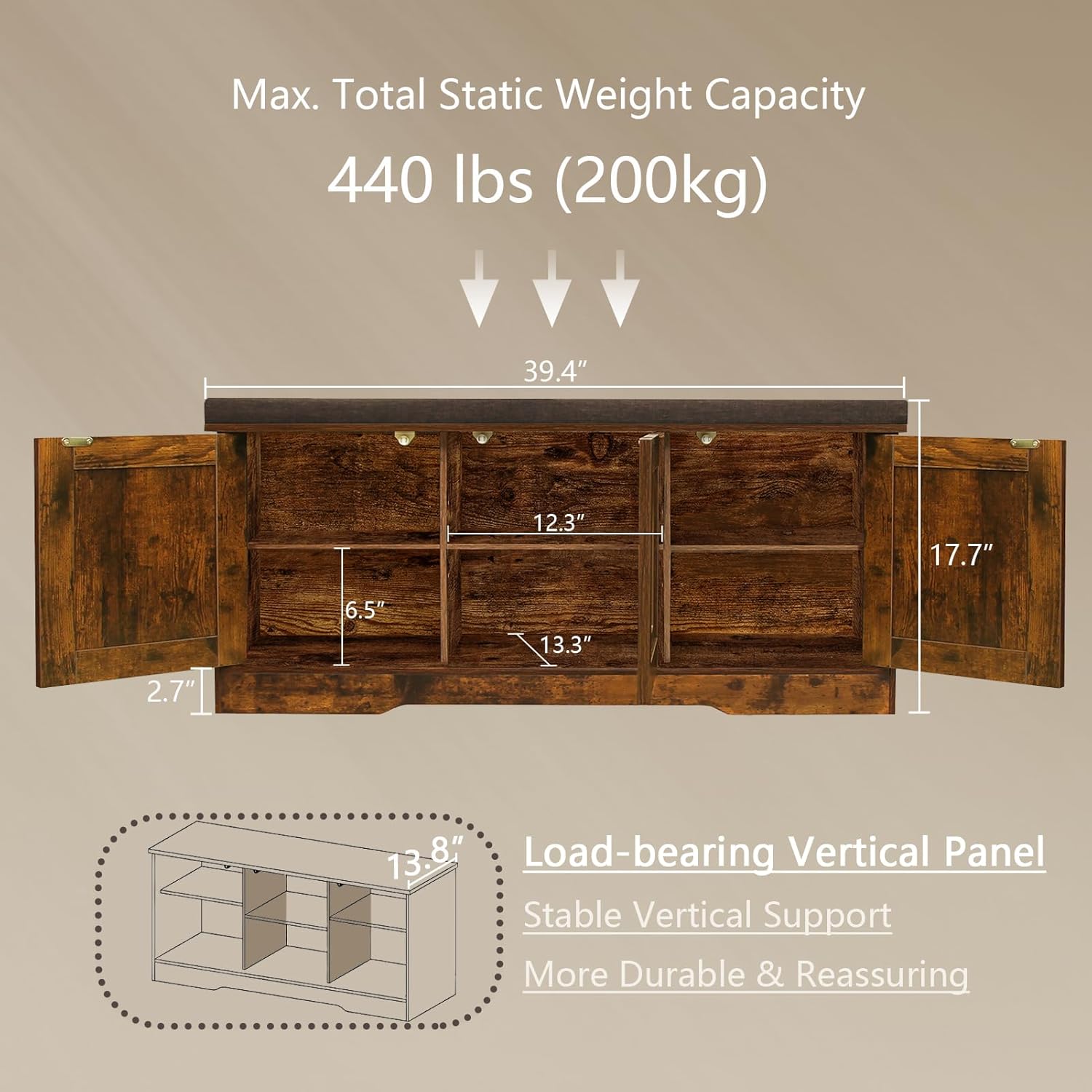 DINZI LVJ Shoe Bench, Entryway Storage Bench with Doors, Cushion, 2-Tier Shoe Rack with 6-Cubby, 39.4”L x 13.8”W Shoe Organizer Cabinet, Adjustable Shelf, Living Room, Bedroom, Rustic Brown