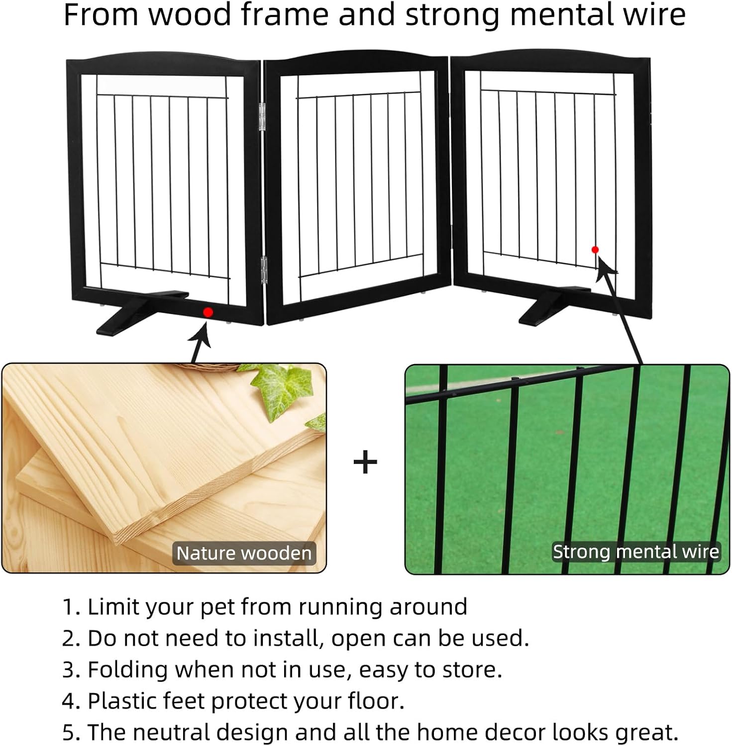 - 【Simple and Firm】This convertible wooden dog gate is a pet fence, room divider, and pet pen all in one. It combines wood and electroplated steel bars. Equipped with non - slip rubber feet, it protects your floor.
