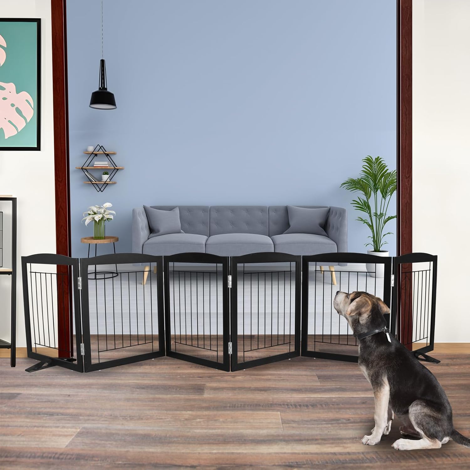 ZJSF Freestanding Dog Fence Indoor, Foldable Dog Gate for Doorways, Stairs or Hallways, Sturdy Wood Extra Wide Pet Gate with Support Feet for The House, Black, 24 "Height-6 Panels