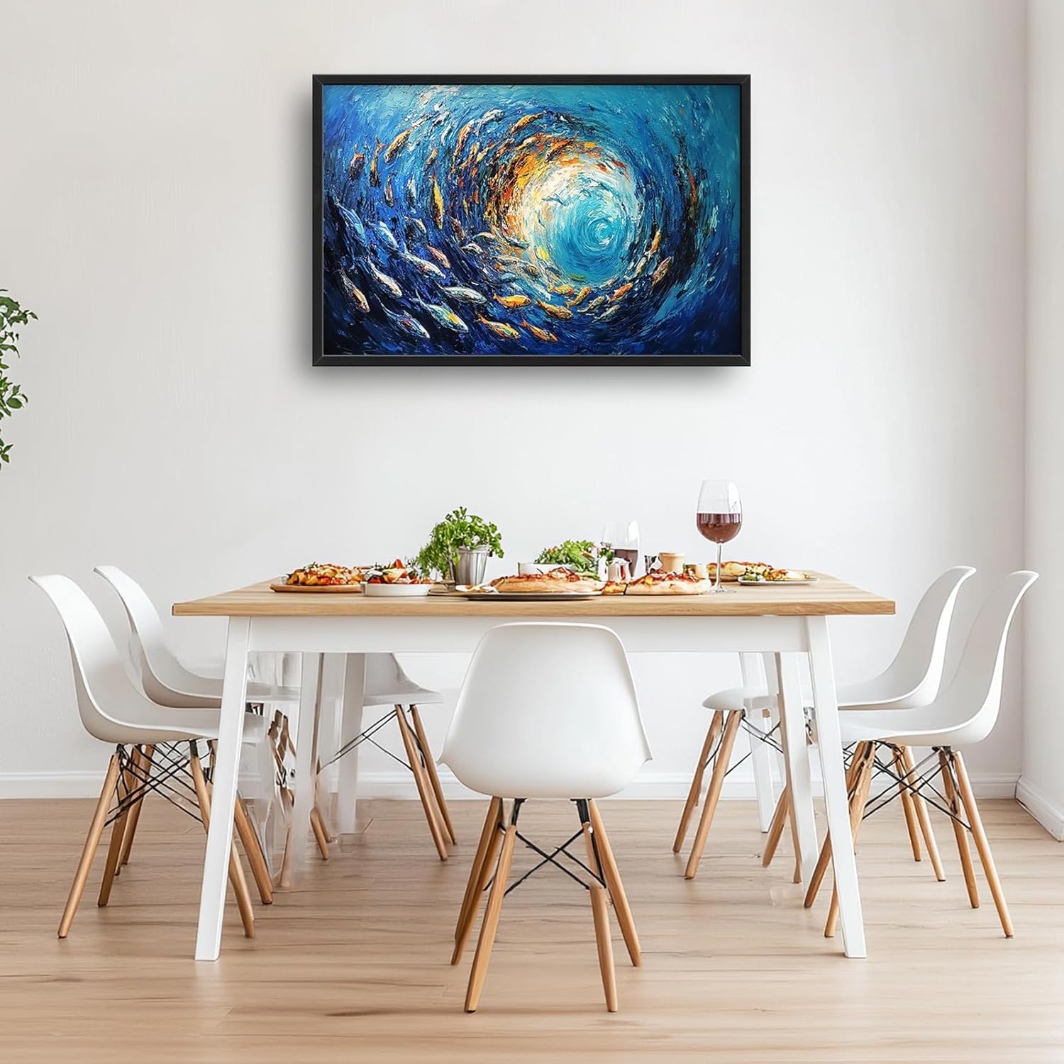 - 【Unique Design】 Oil painting of swirling vortices with fish, vibrant colors, textured brush strokes, large canvas sizes, rich and immersive, sunrays shining upon it, a wealth of details, in the style of Impressionism, swirling motifs, swirling sea, swirling vortices, numerous small fish in the center, against a blue background.