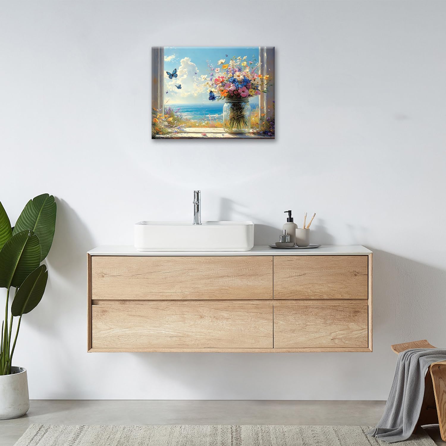 Beach Floral Bathroom Pictures Wall Art, Colorful Flower Bathroom Wall Decor, Coastal Ocean Framed Painting Canvas Artwork for Bedroom Living Room Decorations 16"L x 12"W