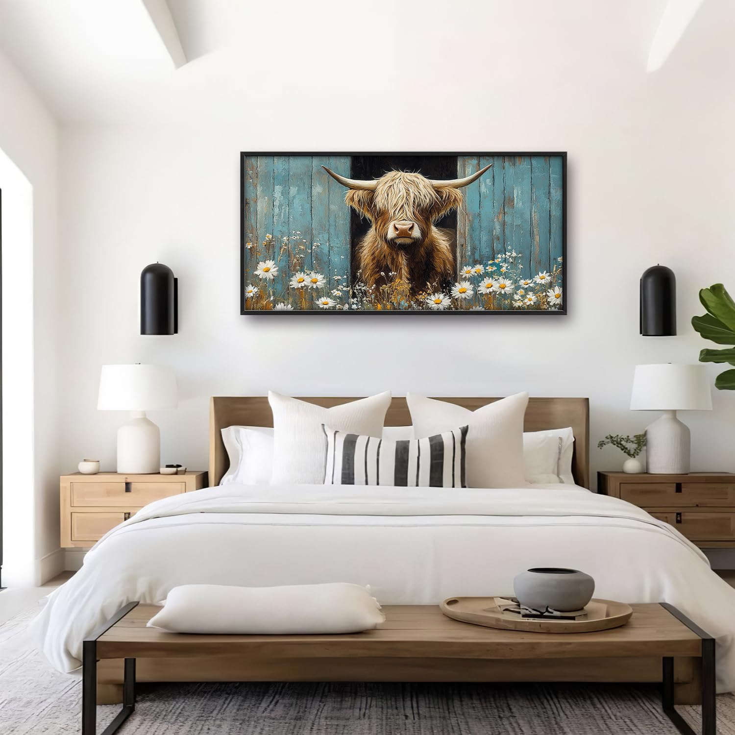 Large Farmhouse Highland Cow Country Wall Art for Living Room, Floral Canvas Oversized Wall Decor, Daisy Flower Animal Framed Pictures Painting Print Artwork for Bedroom Office 60"L x 30"W
