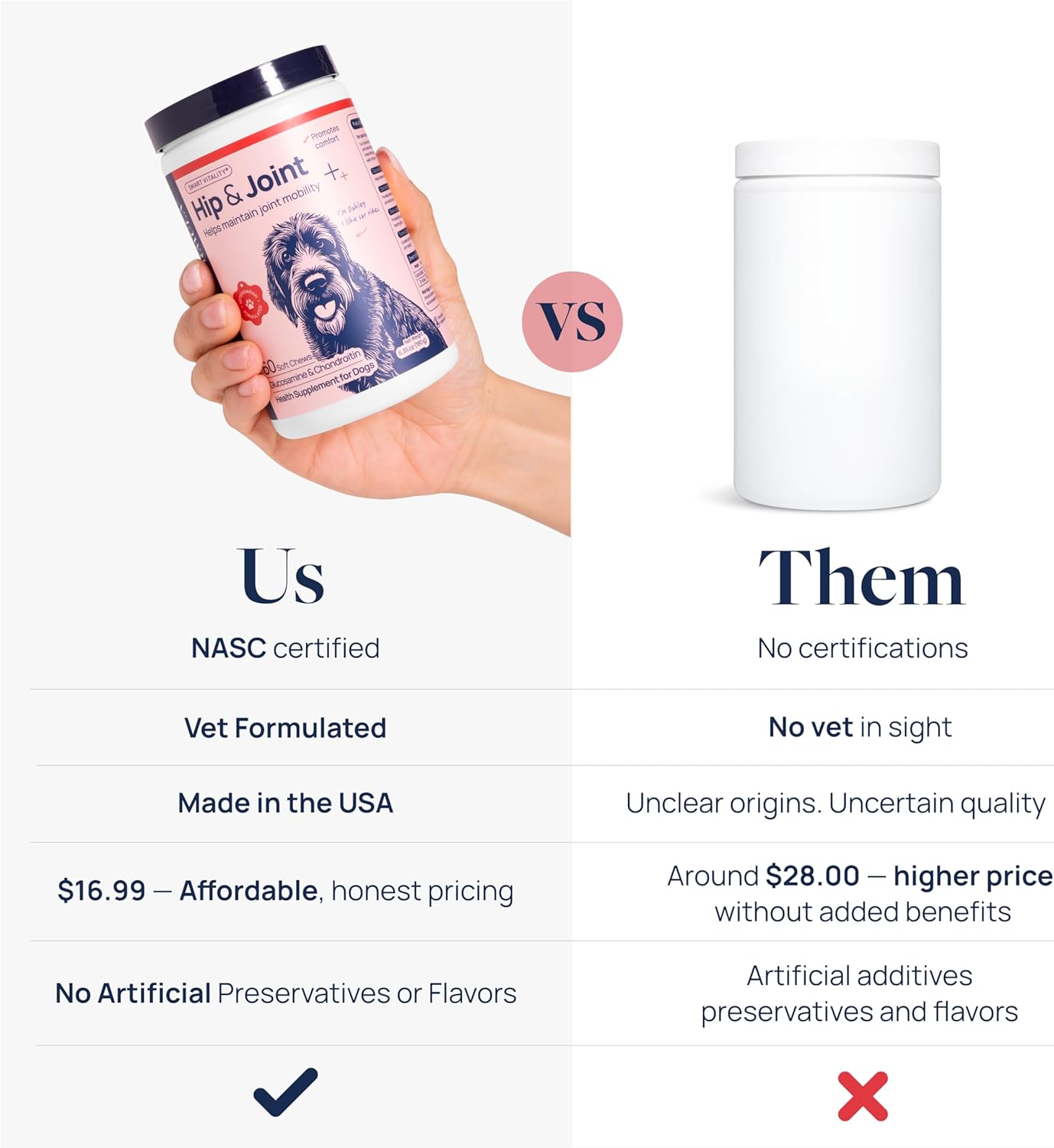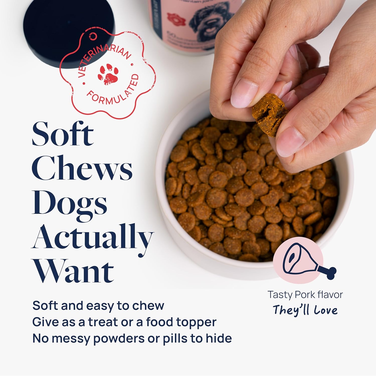 - VET-FORMULATED & TASTY - This delicious pork-flavored hip and joint chews for dogs was formulated by veterinarians. No pills, powders, artificial flavors, or preservatives — just an easy-to-give hip and joint supplement dogs will love.