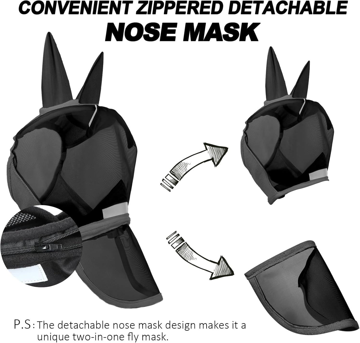 Luminous Horse Fly Mask with Long Nose, Ears, Full Face & Eye Protection - Full Mesh, Detachable Nose Cover, Fleece Padded Edging, Hook-and-Loop Straps with Webbing, Hanging Straps Black