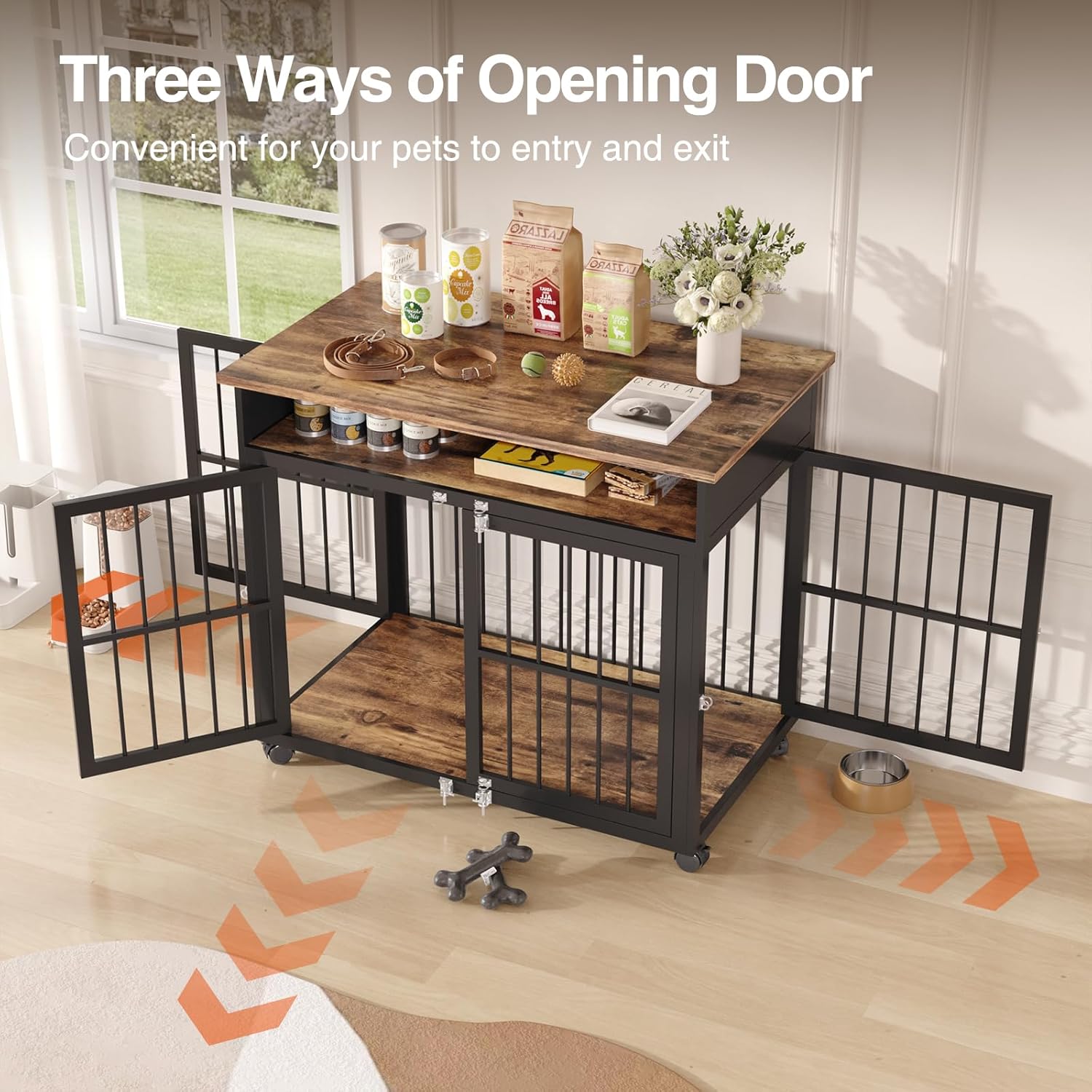 - Furniture-Style Dog Kennel:With a storage shlef, it serves as both a stylish dog crate and a practical side table. It provides space to store dog supplies and decorate your house at the same time! Equipped with 360° lockable wheels, you can easily move it around your house for different needs.