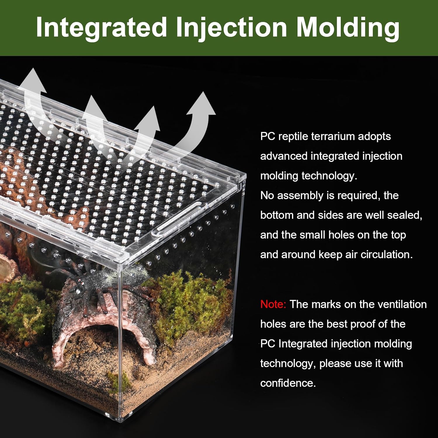 - Integrated Injection Molding: PC reptile terrarium adopts advanced integrated injection molding technology, which is mainly used to make precise and complex parts. No assembly is required, the bottom and sides are well sealed, and the small holes on the top and around keep air circulation. Note: The marks on the ventilation holes are the best proof of the PC Integrated injection molding technology, please use it with confidence.