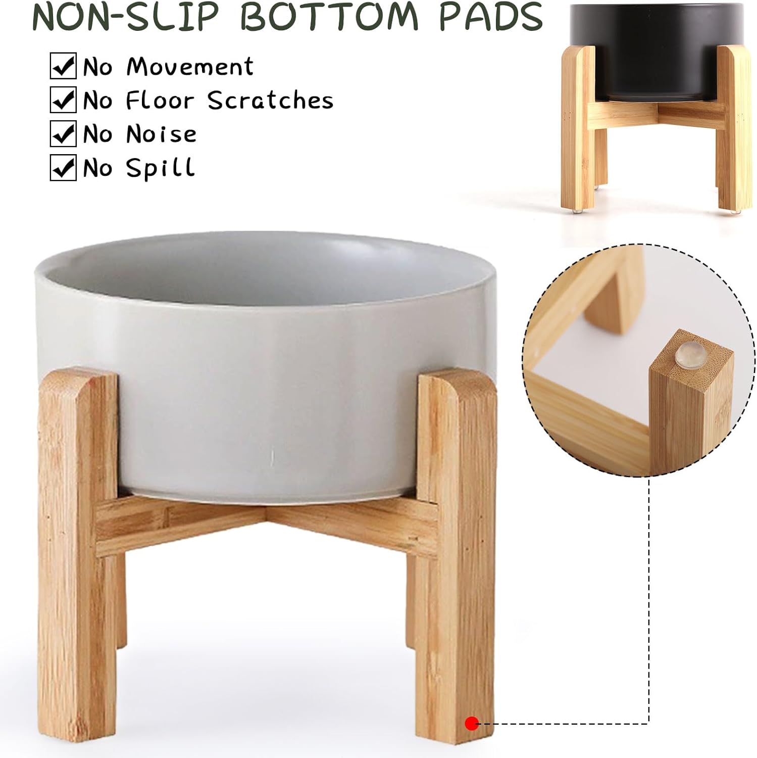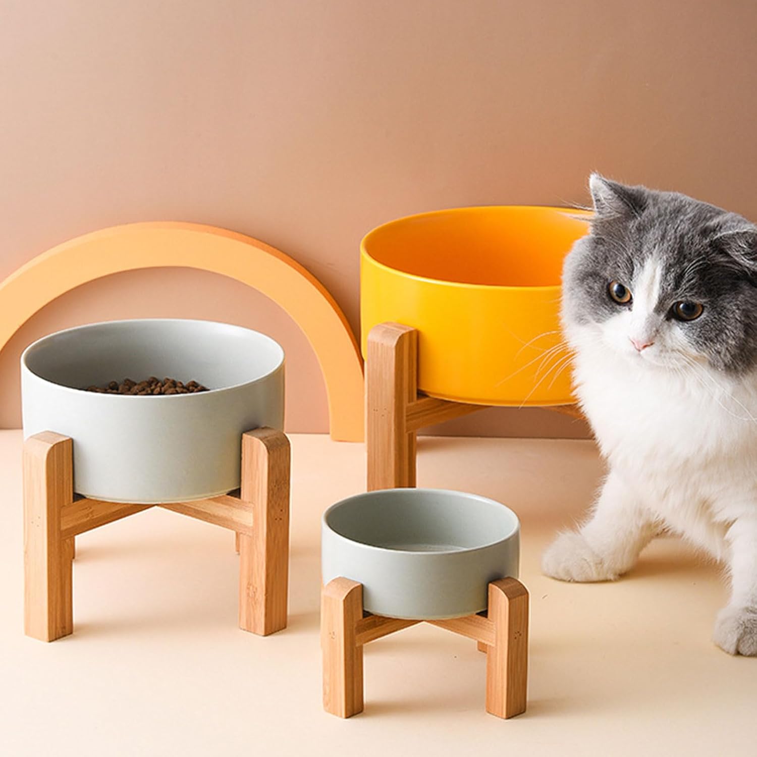 - NON SLIP WOOD STAND -You can get two different heights by flipping the bamboo stand,the elevated cat bowls are perfect for cats and small size dogs from different stages of childhood to adulthood, The wood stand on the bowls stopping ceramic cat dog bowl from sliding around, Keeps pet food and water in the bowls.