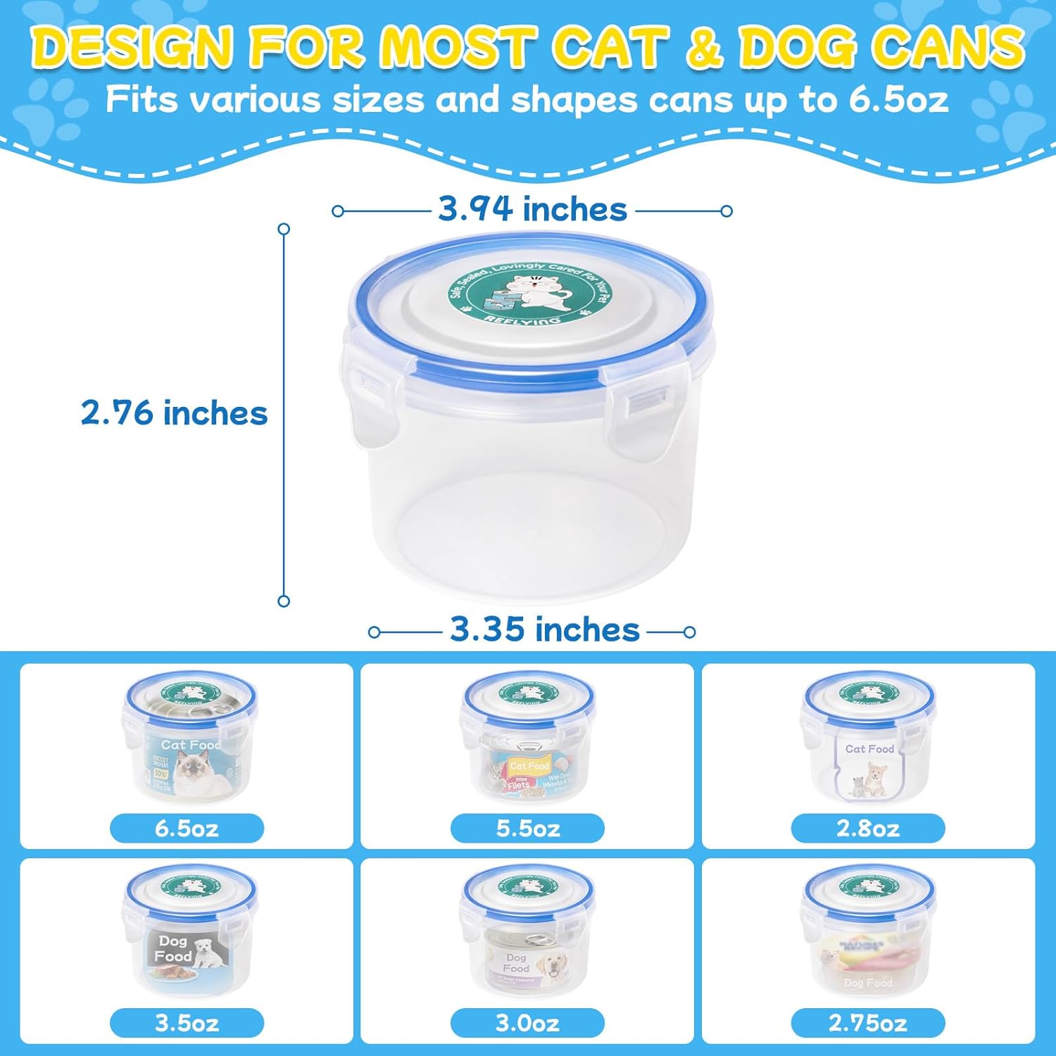 - FITS MOST 3 oz PET FOOD CANS: This versatile pet food storage container is designed to fit most standard-size cat & dog food cans. This air tight dog food storage container measures 3.35 x 2.76 inches, fits most standard up to 6.5 oz cat & puppy can food sizes. can directly store opened cans, or inverted cans for easy access,or store canned meat chunks directly and for homemade pet meals