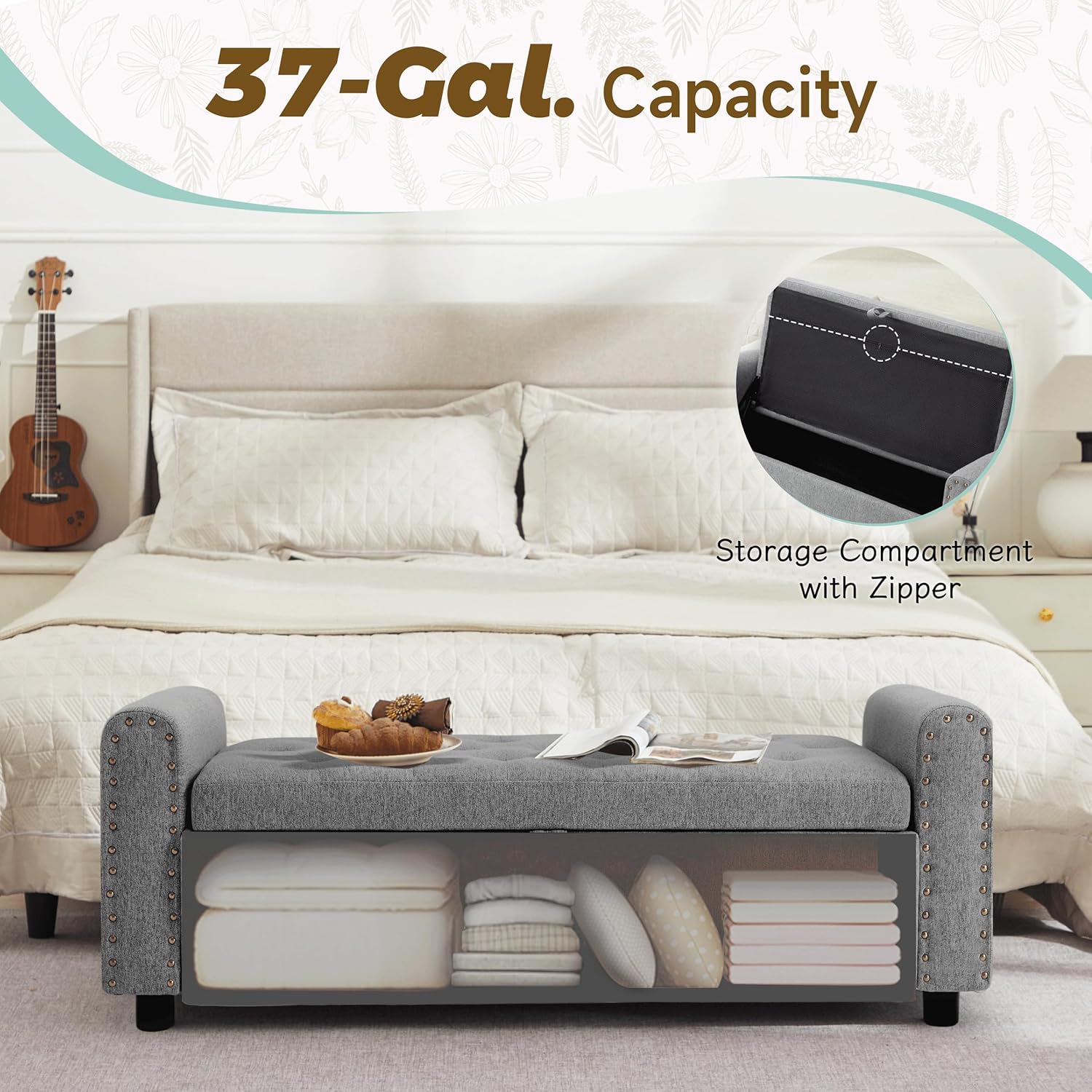 - ๐๐ง๐ญ๐๐ซ ๐ ๐ซ๐จ๐ง๐ญ ๐๐จ๐๐ค๐๐ญ ๐๐จ๐ซ ๐๐๐ฌ๐ฒ ๐๐๐๐๐ฌ๐ฌ ๐ญ๐จ ๐๐ฌ๐ฌ๐๐ง๐ญ๐ข๐๐ฅ๐ฌ-Our storage bench has a larger capacity of 37 gallons, allowing you to store more items. In addition, it features creative and thoughtful designs that take everyday usability in mind. Inside the front panel, youโll find 2 pocketsโperfect for stashing items you need often, like socks, remote controls, keys, or earbuds. No need to dig through everything to grab what you use most.